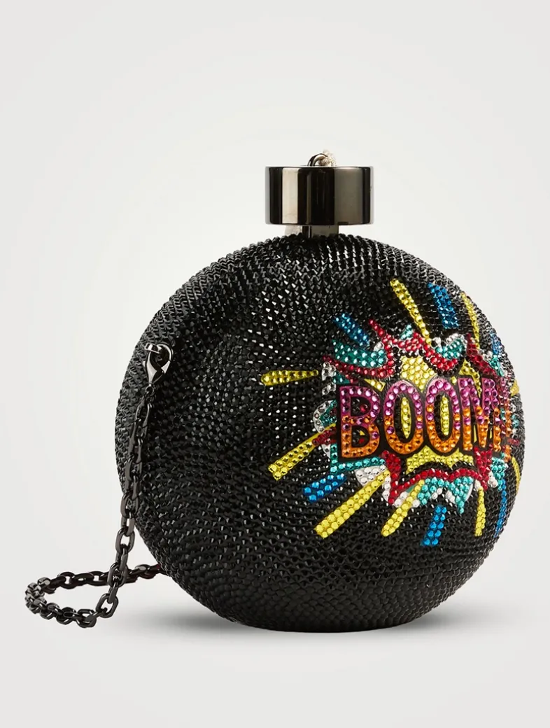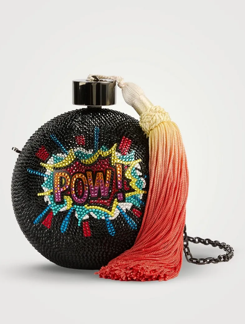 Make a style impact with the sphere-shaped Fuse crystal clutch featuring a unique chain-link wristlet and flaming tassel. Finished with a whimsical POW design and a metallic leather interior.