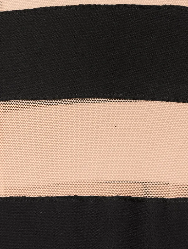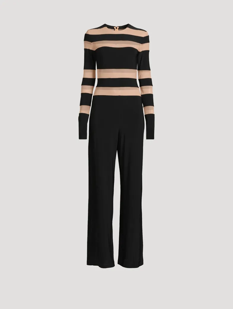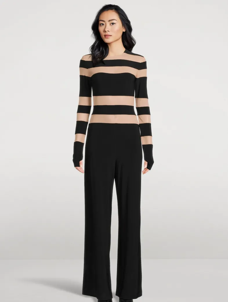 This chic jumpsuit features AI-generated detailing. Its bodice has long sleeves with thumbholes and delicate mesh inserts to reveal a subtle hint of skin. The top is paired with wide-leg trousers with a solid jersey design.