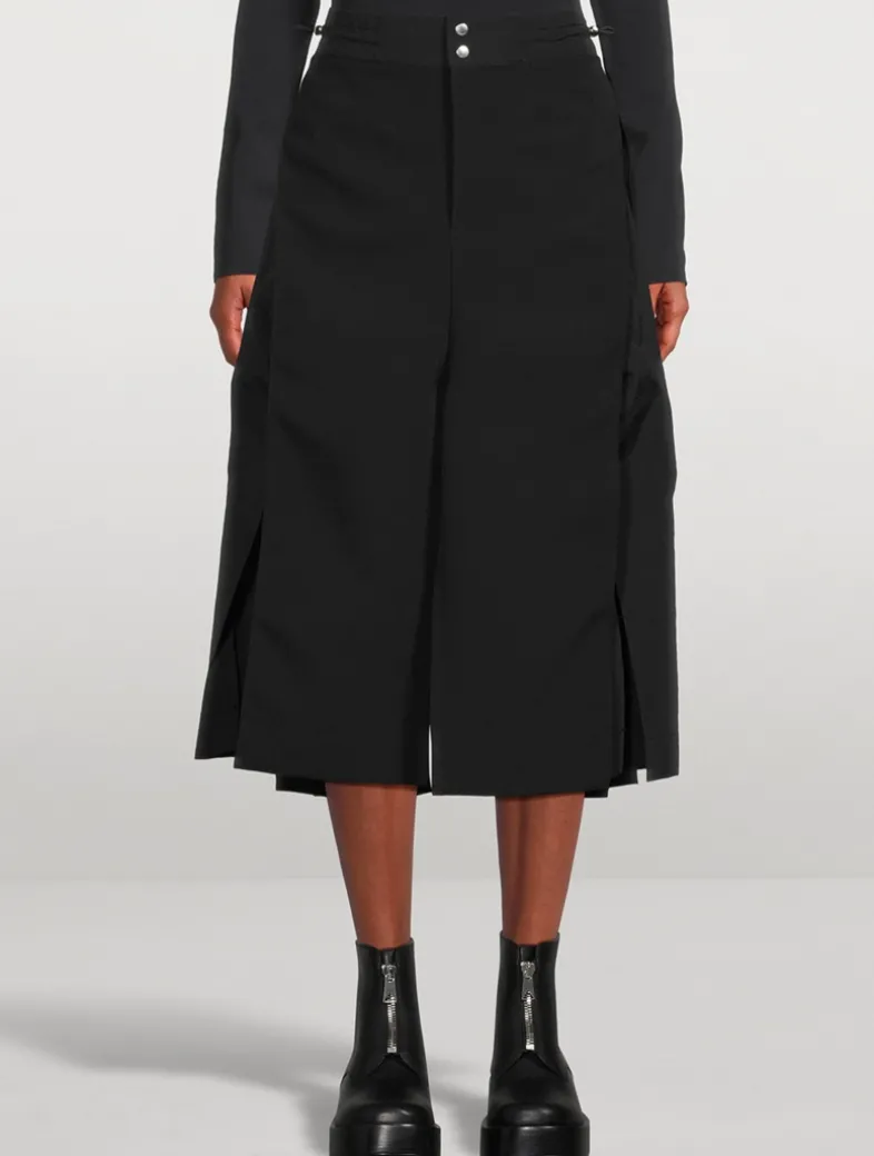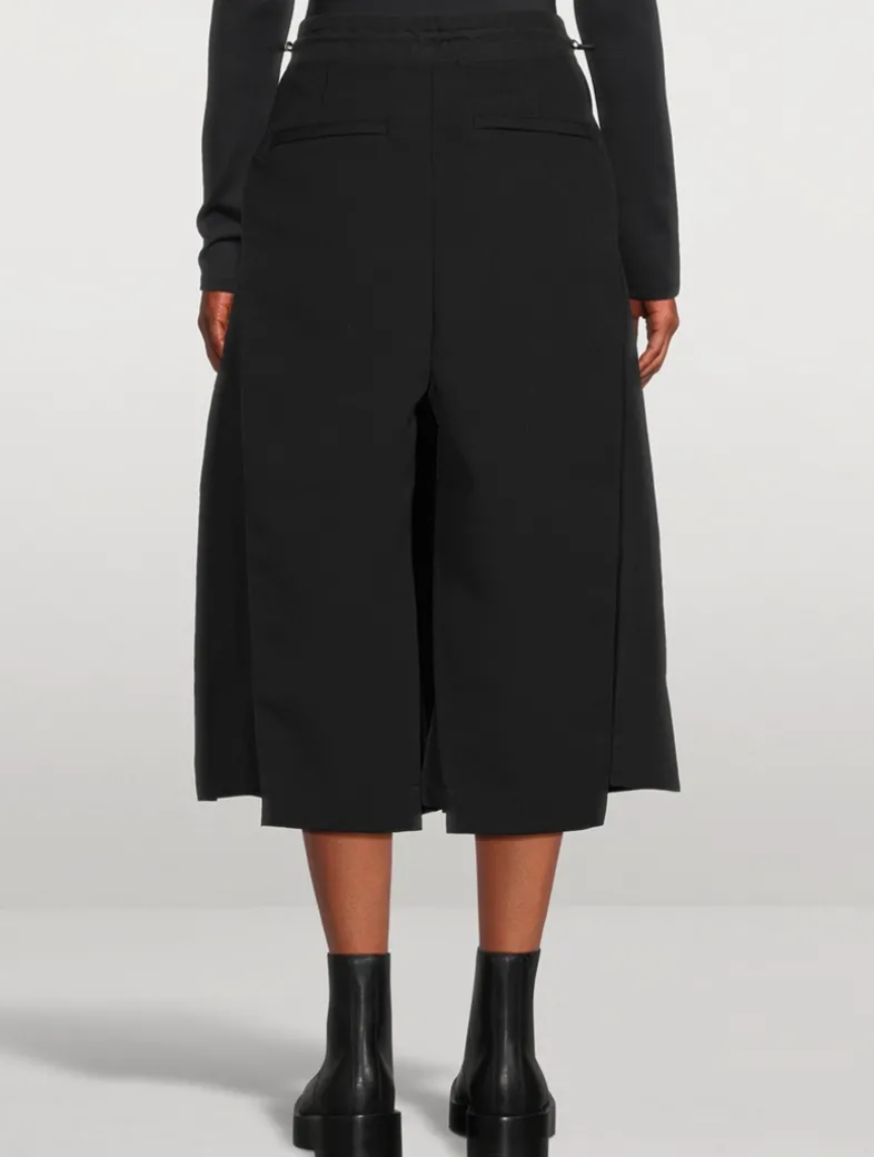 These trousers are cut to a wide-leg silhouette with extra-long slits at the sides to enhance their fluttering shape. They have a high-rise waistband detailed with adjustable drawstrings. Finished with welt pockets at the rear.