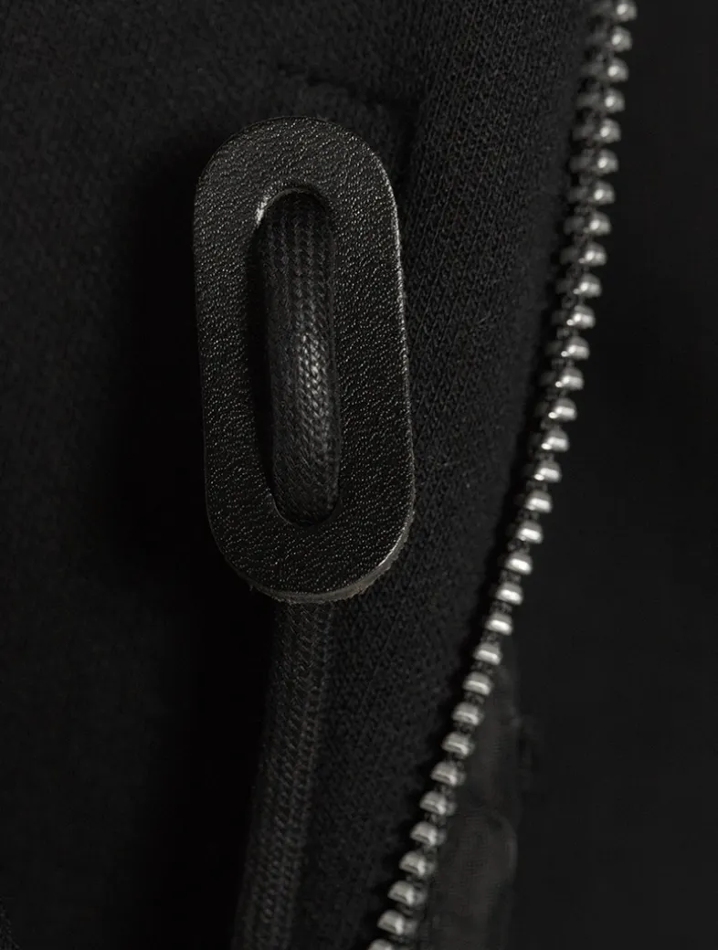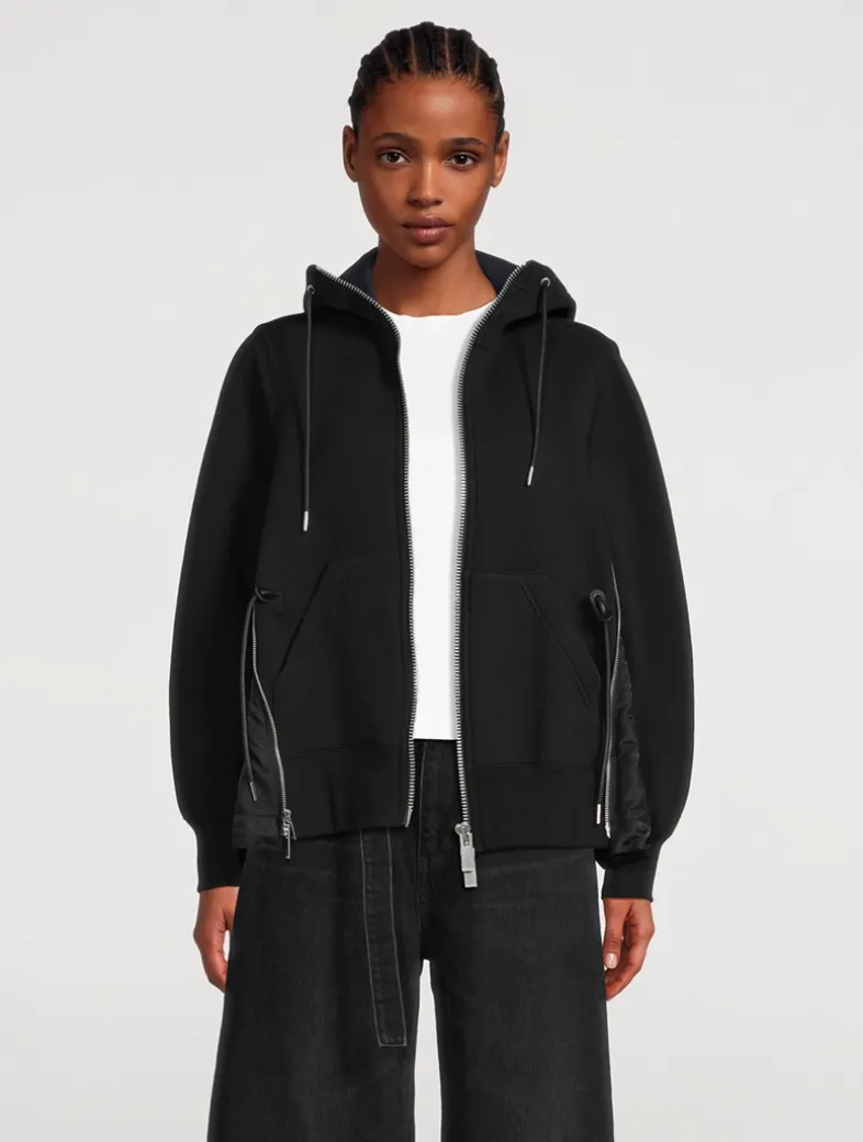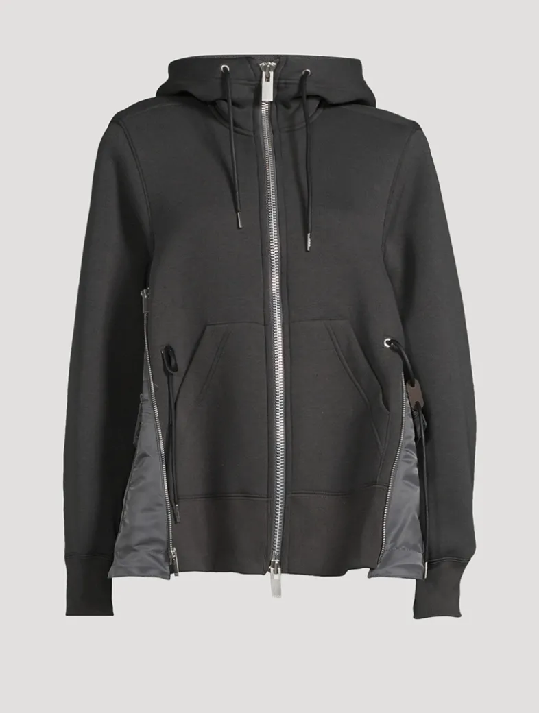 Cut to an oversized shape, this hoodie is spliced with zippered vents with nylon panels and cargo pockets. Drawcords make the hood and waist adjustable.
