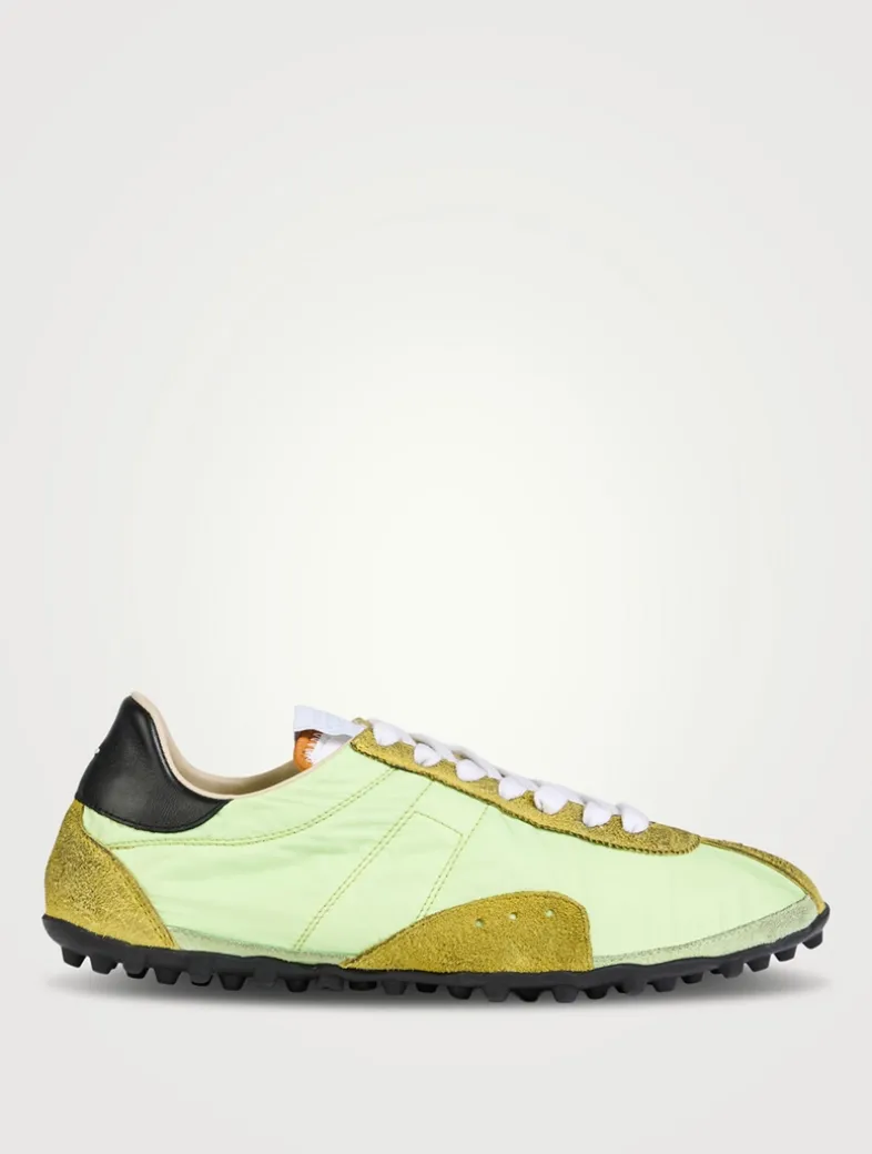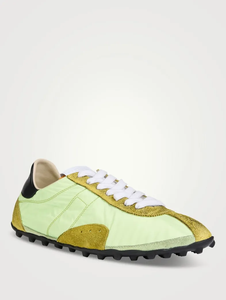 A distressed finish lends a live-in touch to this pair of low-top sneakers, which features a lace-up vamp and treaded sole.