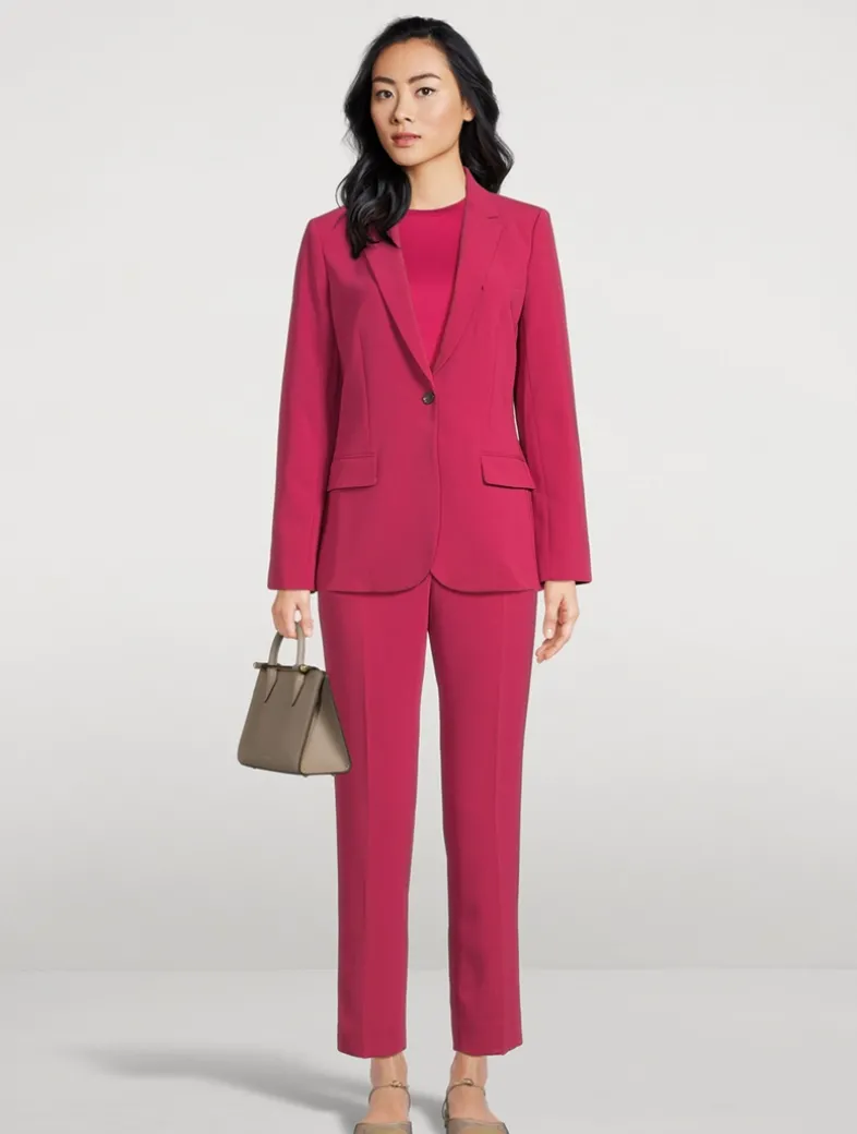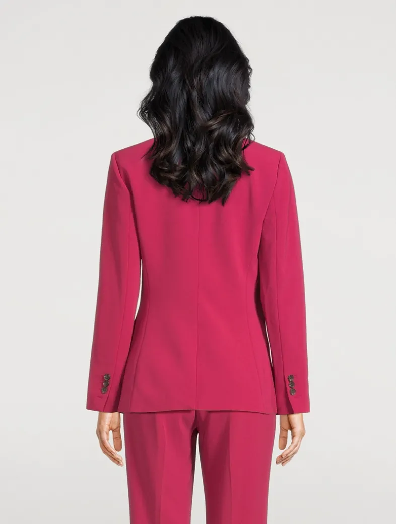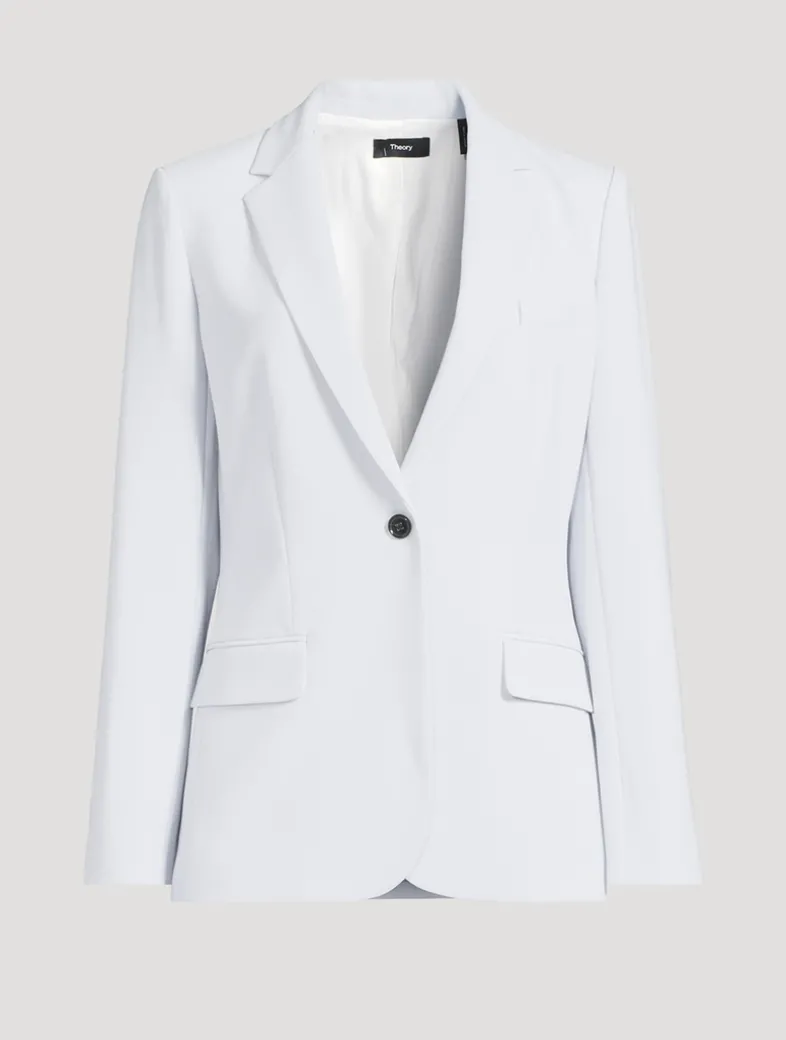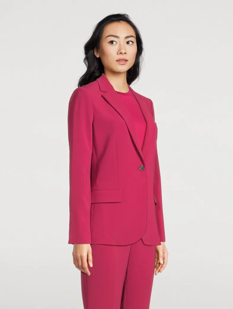 The Staple blazer is a slim-fitting silhouette that’s lightly constructed and features a single-button front closure and notch lapels. Offered in Theory’s signature Japanese Admiral Crêpe, it’s detailed with an angled chest pocket, cutaway front, and waist flap pockets. The material is woven with triacetate, a fabric made from acetic acid and wood pulp sourced from sustainably managed forests. Certified to OEKO-TEX® Standard 100, LEATHER STANDARD, or OEKO-TEX® MADE IN GREEN.