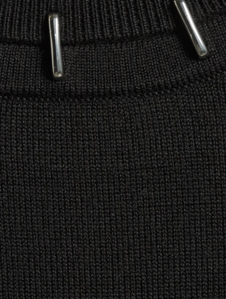 Staple-inspired hardware highlights skin-revealing cut-outs along the neckline and cuffs of this pullover. A modern take on a wardrobe essential, it is designed with a rounded collar, long sleeves, and a fitted silhouette in a mix of wool and silk.