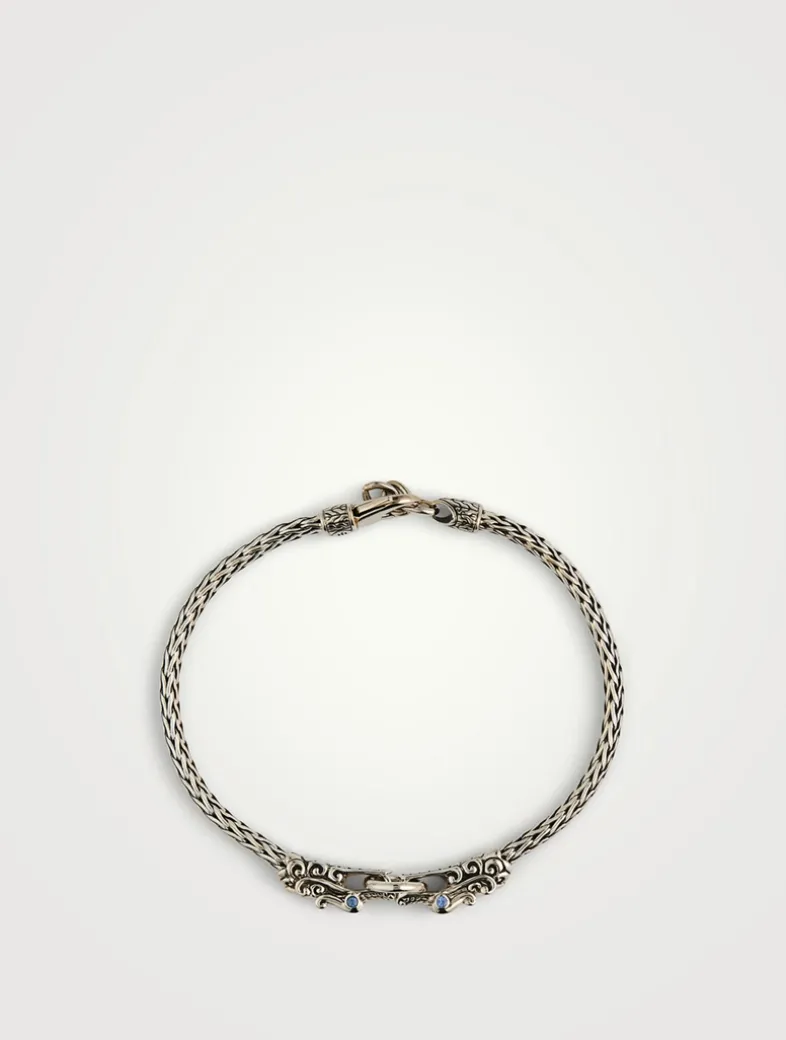 The Naga dragon symbolizes protection, eternal love and prosperity. This evocative bracelet features captivating blue sapphire eyes and pavé accents to create a graphic, contrasting look against sterling silver.