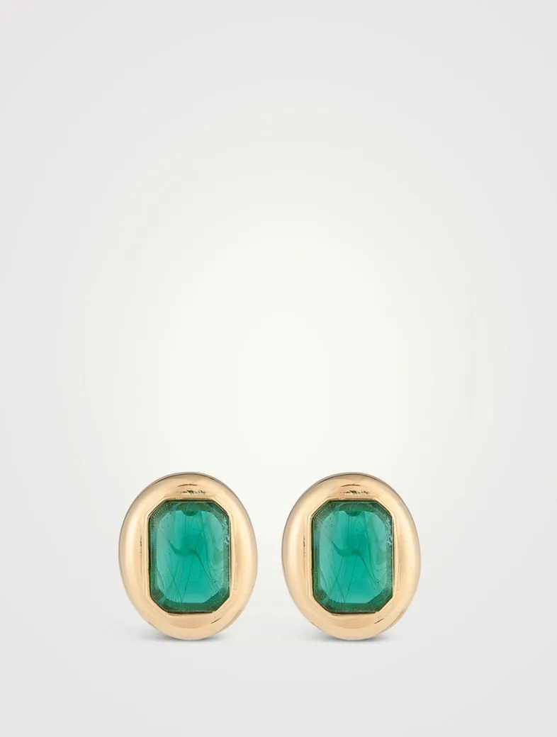 These clip-on earrings show case emerald-cut stones in gleaming gold-plated settings.