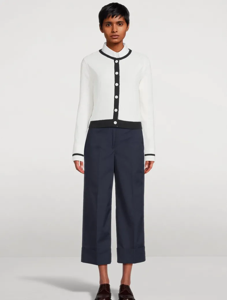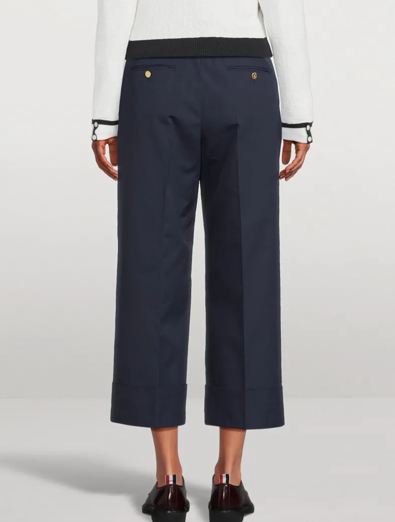 A sophisticated trouser with a shortened hem and folded cuff that pays homage to Thom Browne’s distinguished tailoring. Made in Italy from a lightweight cotton blend with pockets at the sides and rear.