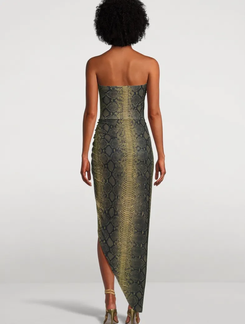 Flaunting a squareneck design, this strapless dress is designed with soft, asymmetric ruching at the waist and thigh-high side slit detailing. Finished in a pullover, fitted silhouette.