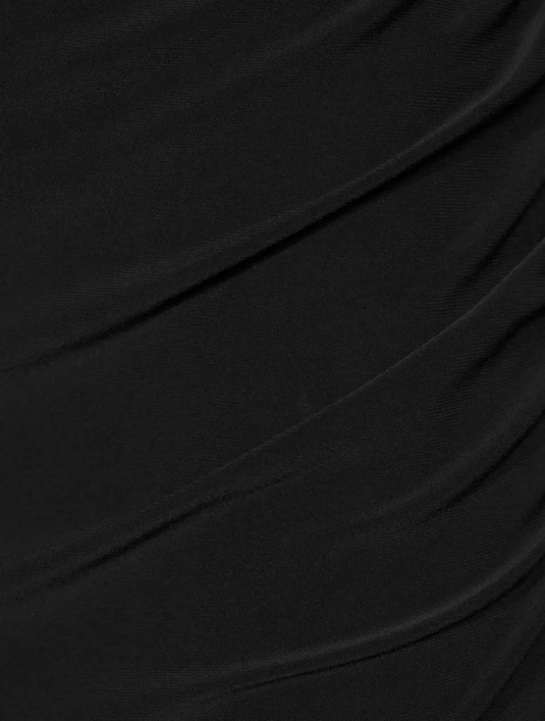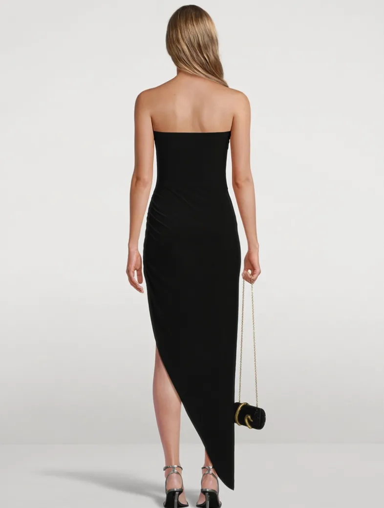 Flaunting a squareneck design, this strapless dress is designed with soft, asymmetric ruching at the waist and thigh-high side slit detailing. Finished in a pullover, fitted silhouette.