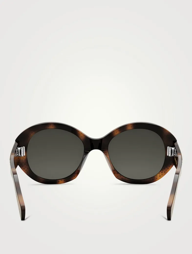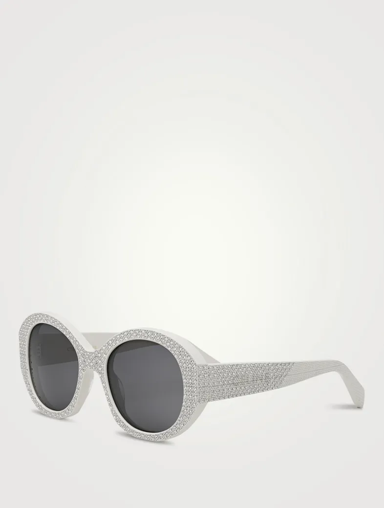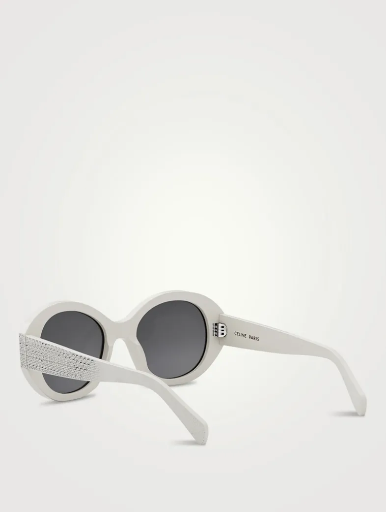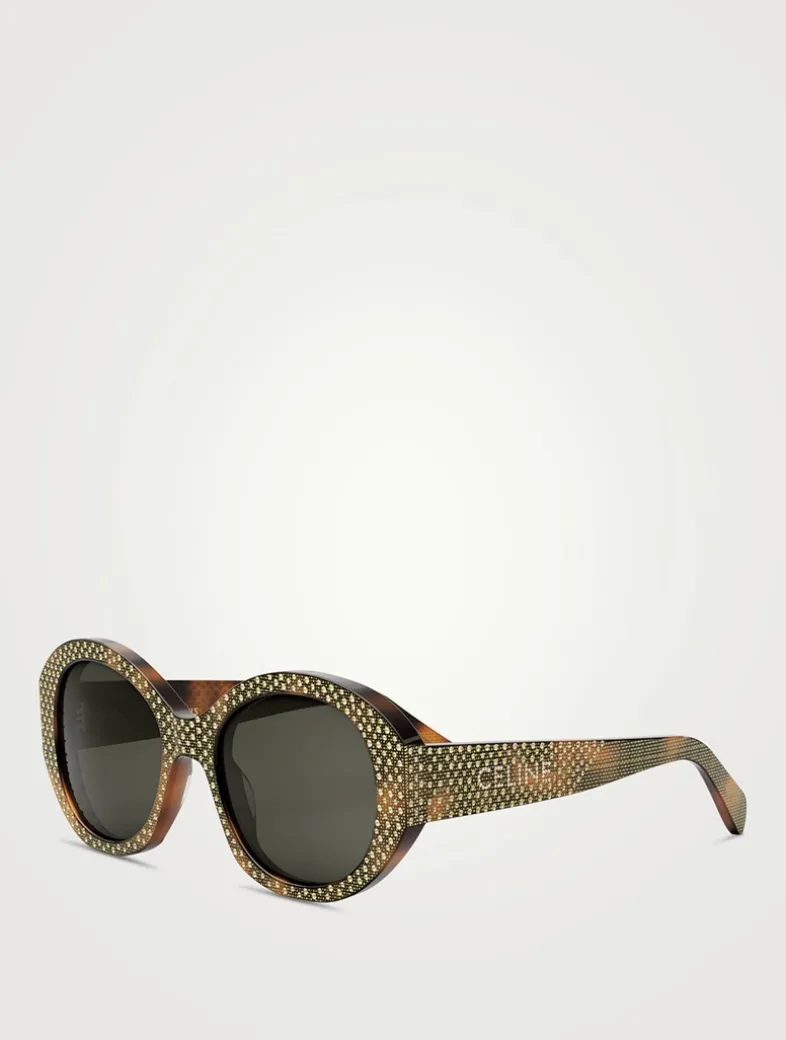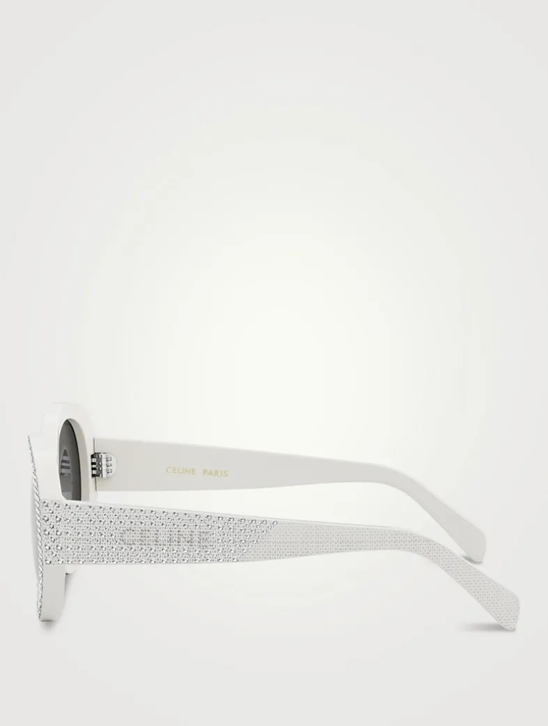 The round, graphic shape of these sunglasses is highlighted with sparkling strass gems. CELINE logo lettering further enhances the temples.