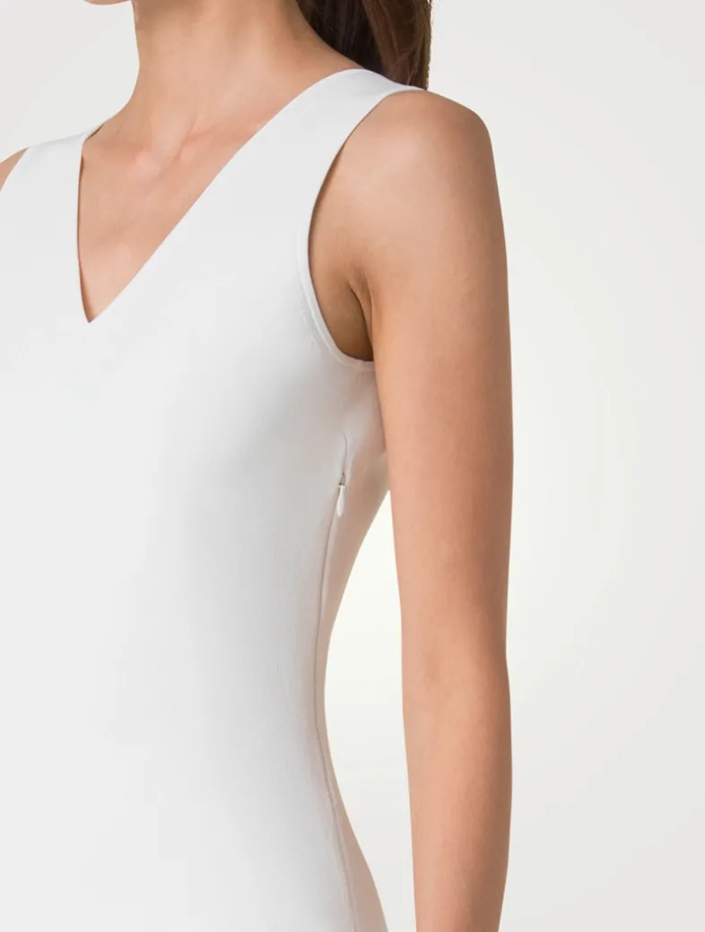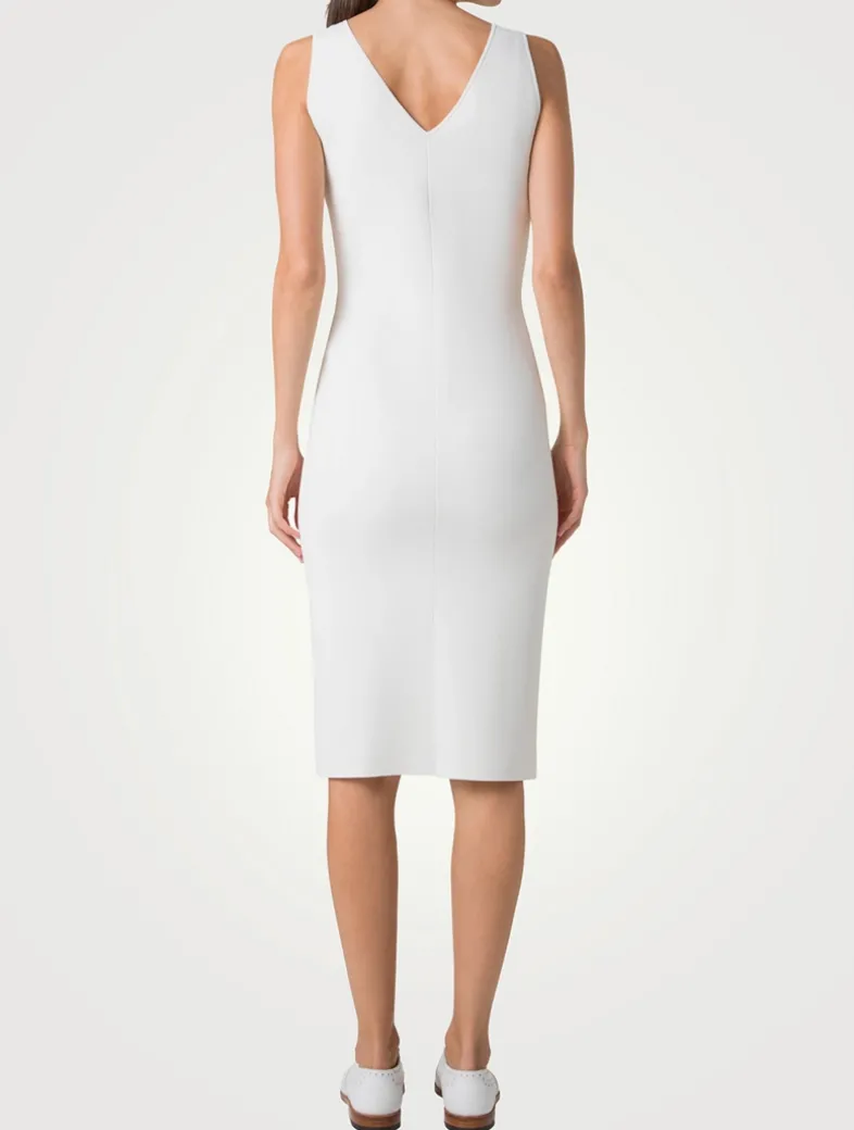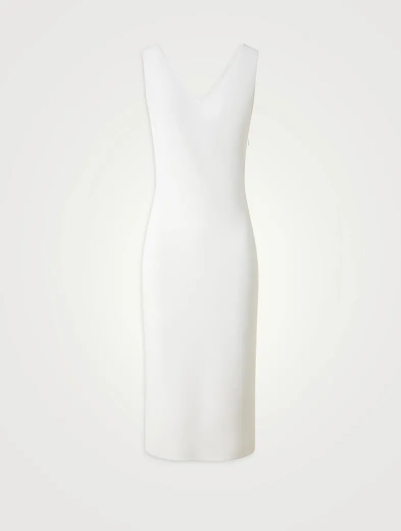 This fitted midi dress plunges at the neck and the back, with a slinky silhouette that’s enhanced by the sleeveless cut. Falling just below the knee, the stretch knit allows the skirt to keep its wiggle shape without sacrificing comfort.