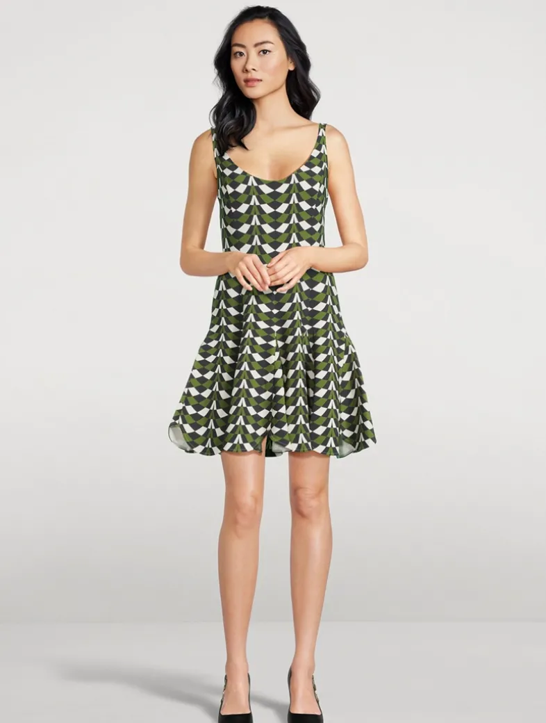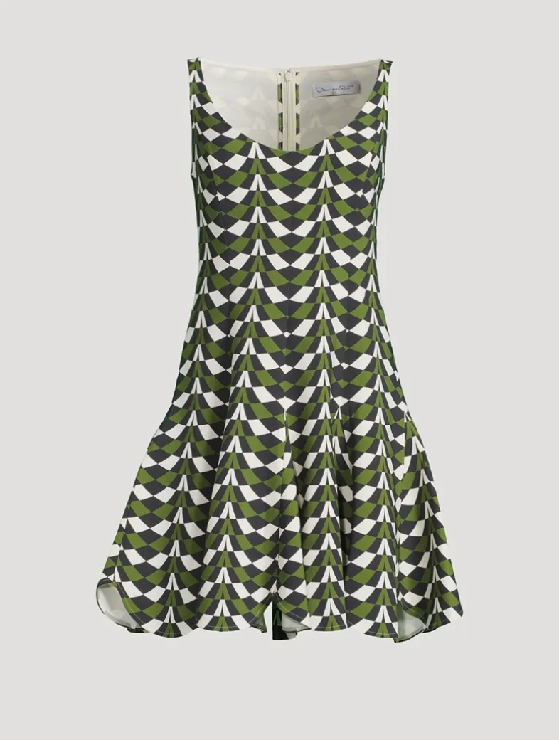 Crafted from a luxe wool with a hint of stretch, this playful dress is printed with a graphic geometric motif. It has a flattering scooped neckline and a fitted bodice that falls to a flared mini skirt.