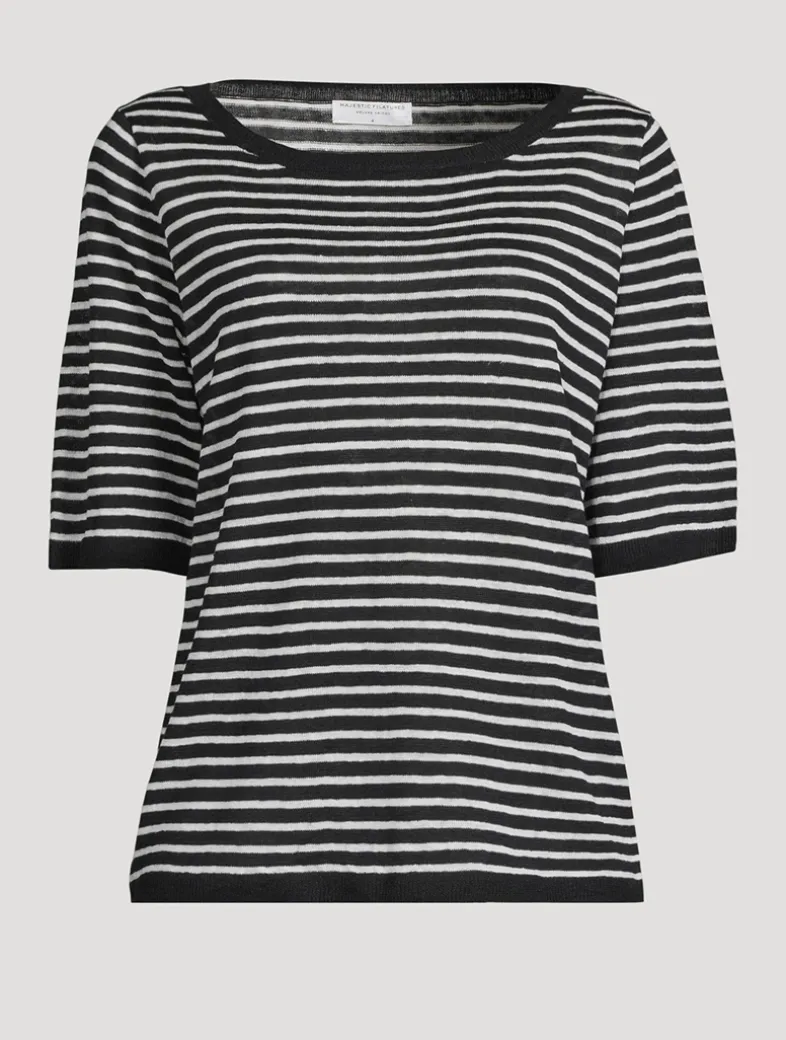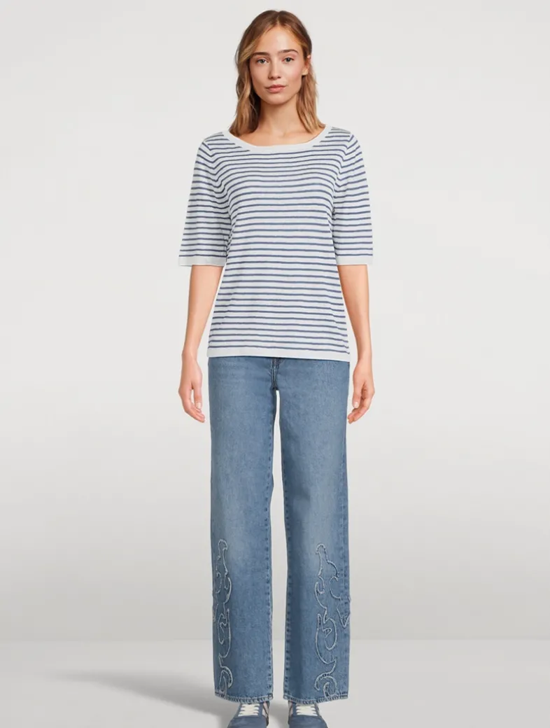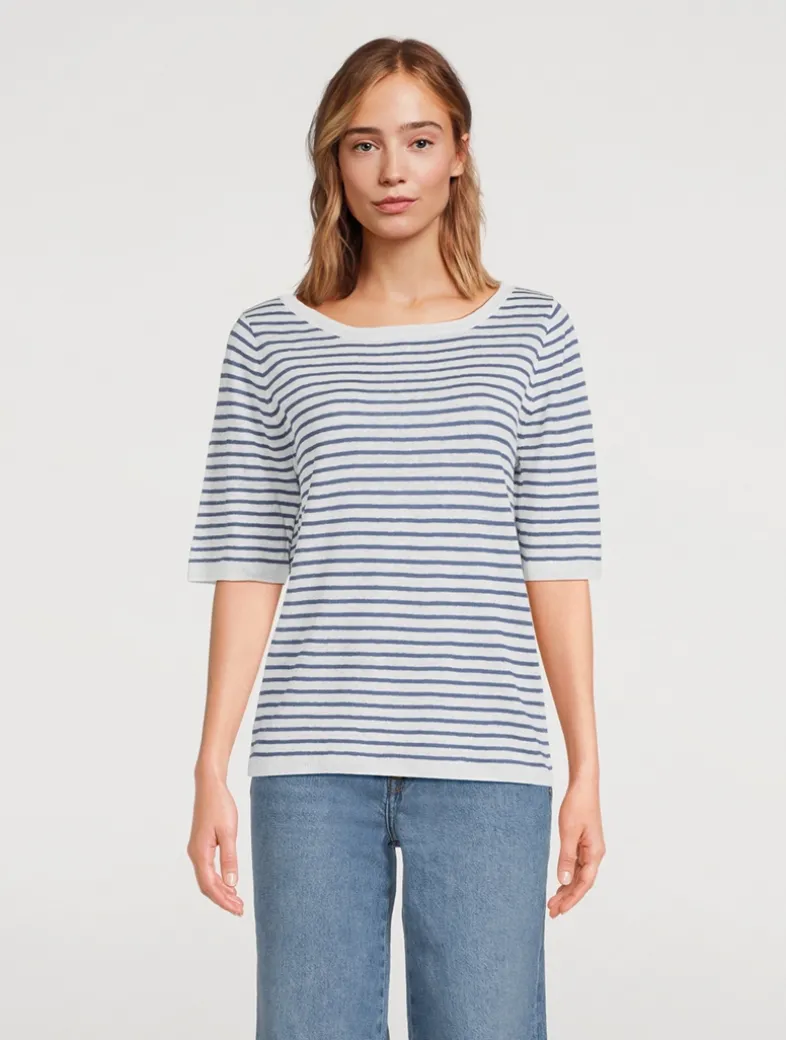 Knit from linen, this sweater flaunts a relaxed silhouette with a bateau neckline and short sleeves. Horizontal stripes lend a nautical touch to the piece, which is finished with solid ribbed trim.
