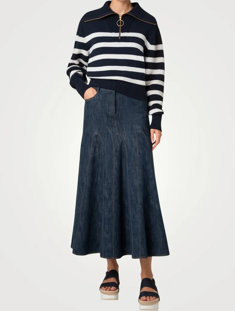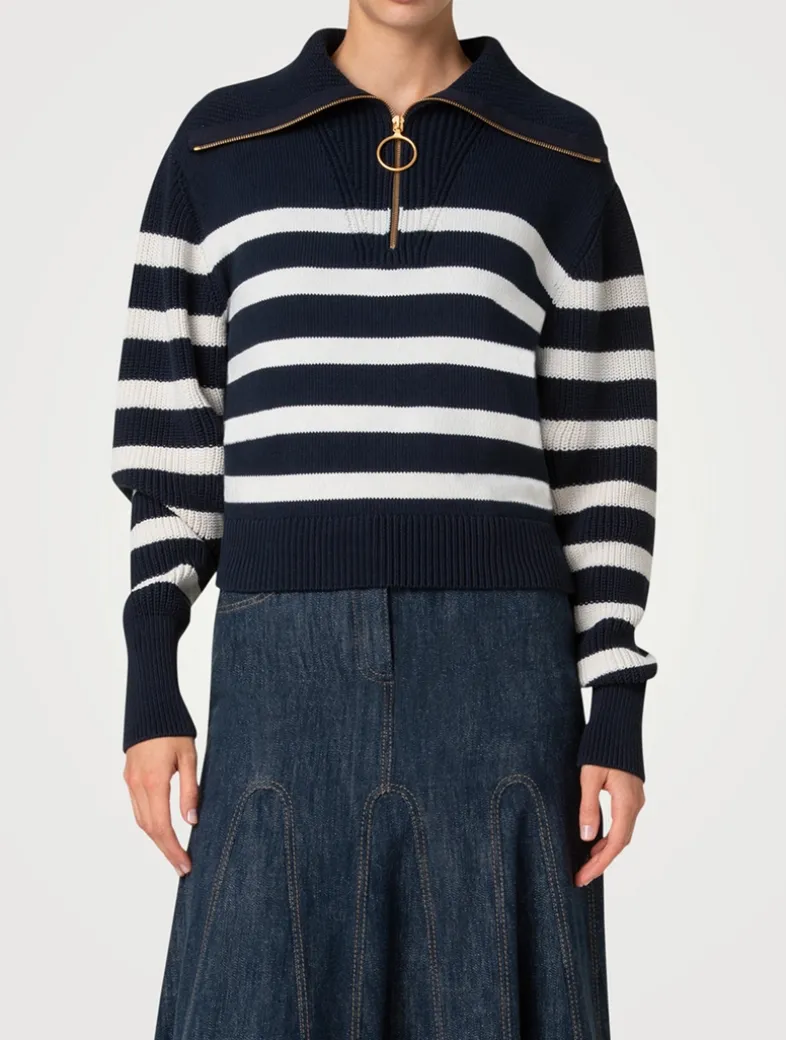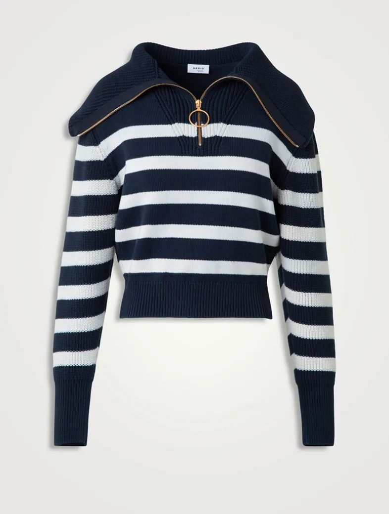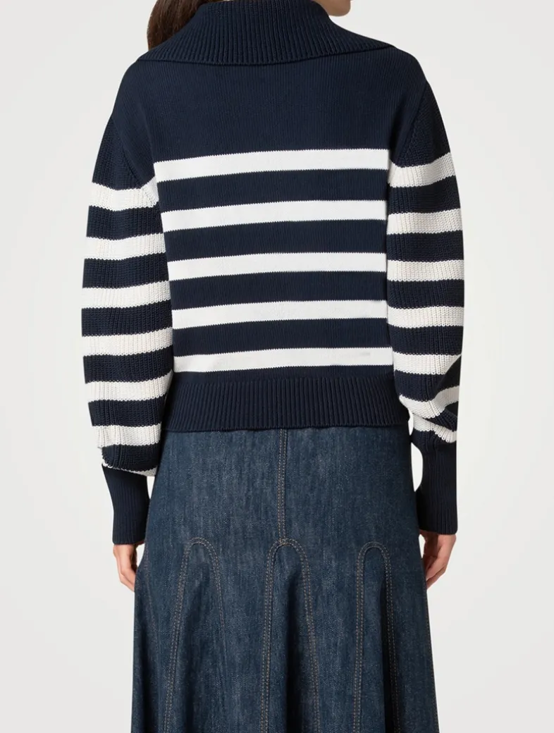 A maxi polo collar frames the zip-front neckline of this long-sleeve sweater. Knit from cotton yarn, it has a classic nautical striped motif and a slim fit.