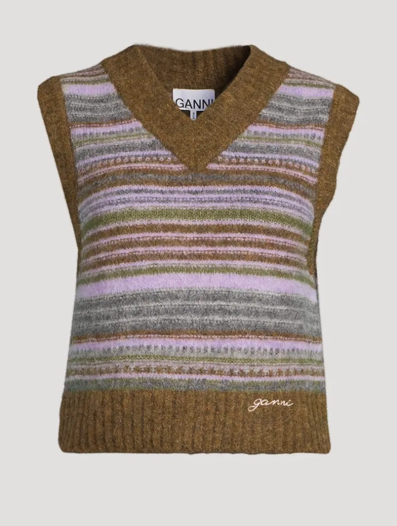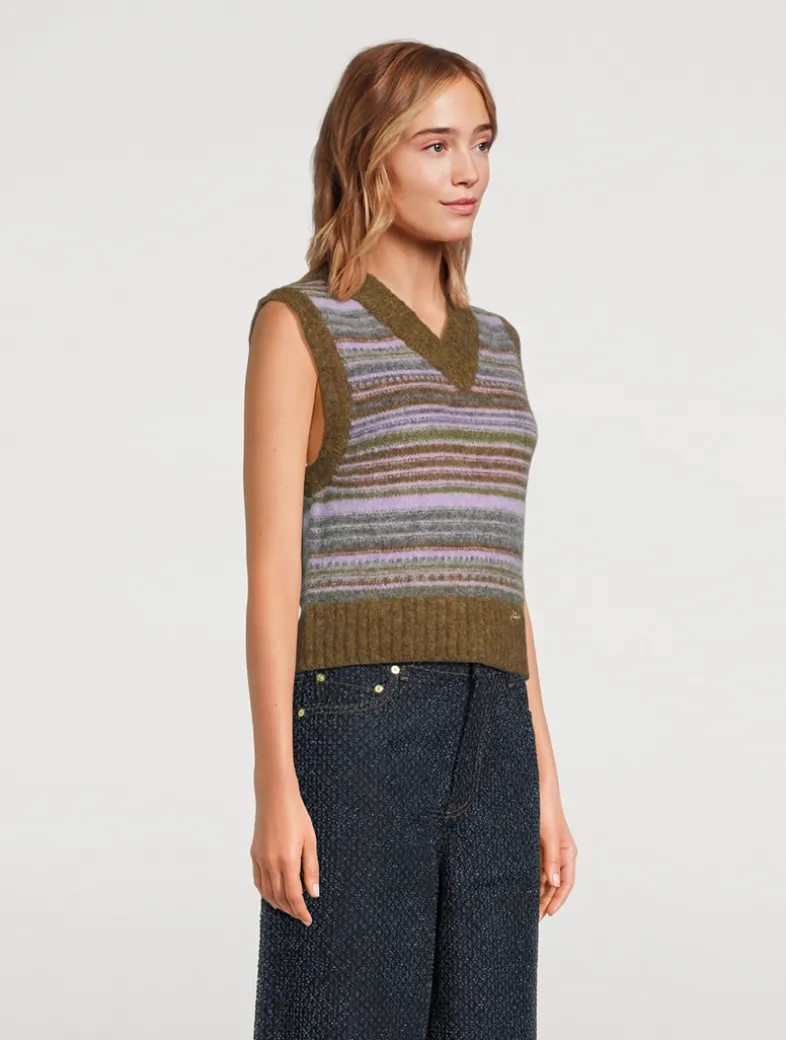 Knit from a soft mix of alpaca and merino wool with a hint of stretch, this sleeveless sweater has a vintage-inspired striped motif with ribbed trim. Cut in a fitted silhouette, it is finished with logo embroidery at the hem. Certified to the Responsible Alpaca Standard (RAS).