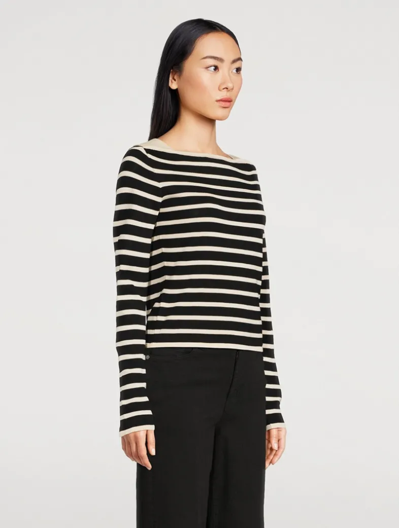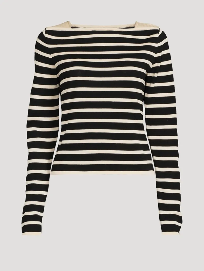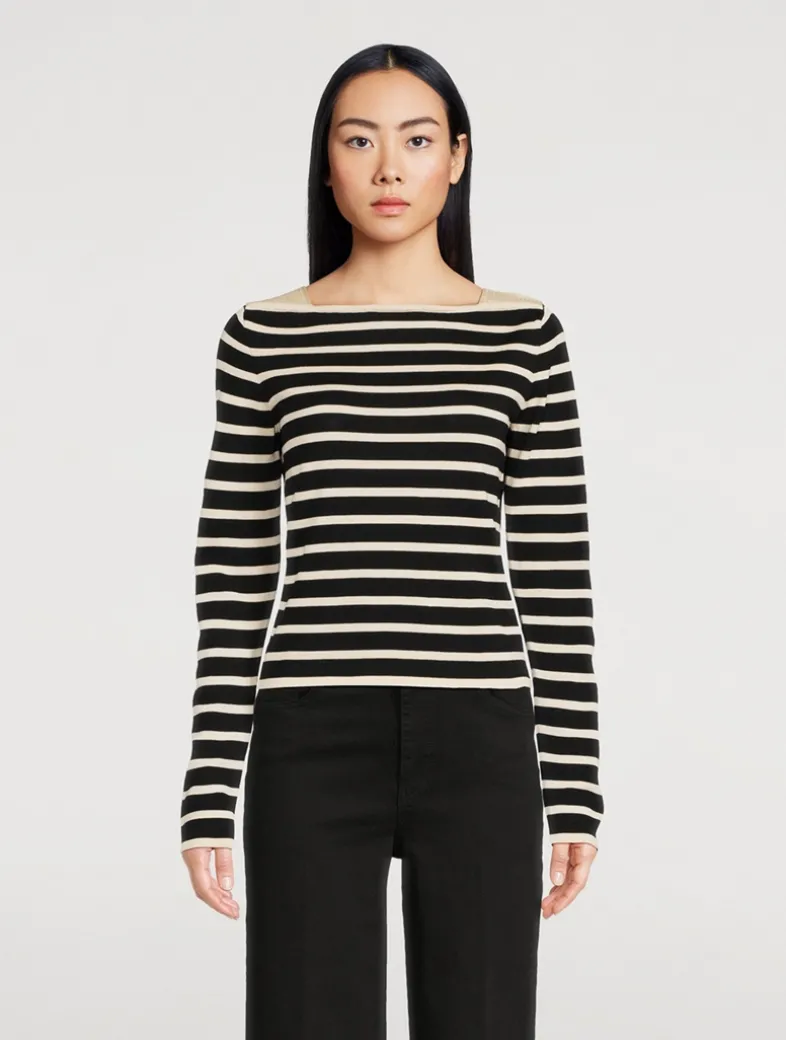 Mariner stripes and a chic bateau neckline give this sweater a polished look that elevates day-off outfitting. Featuring a slim-cut fit, this sweater re-envisions classic Breton stripes for an edgier take on a timeless style.