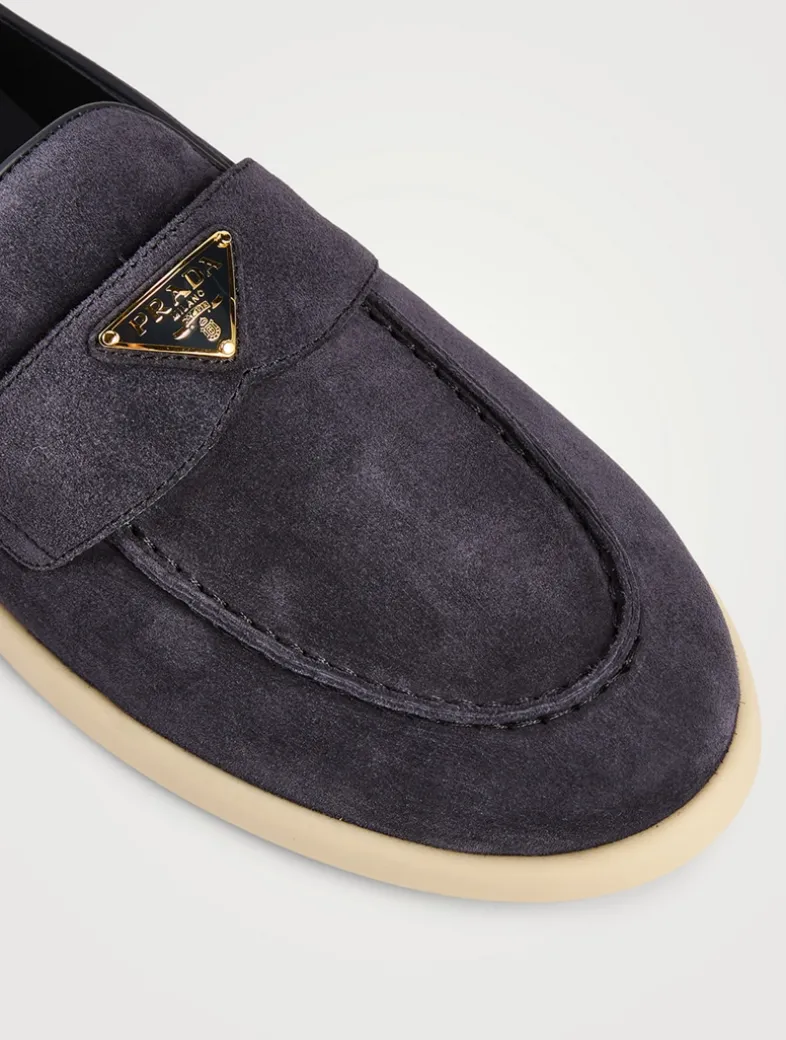 These suede loafers with classic charm feature a pinched stitch seam on the upper and are decorated with the enamelled metal triangle logo.