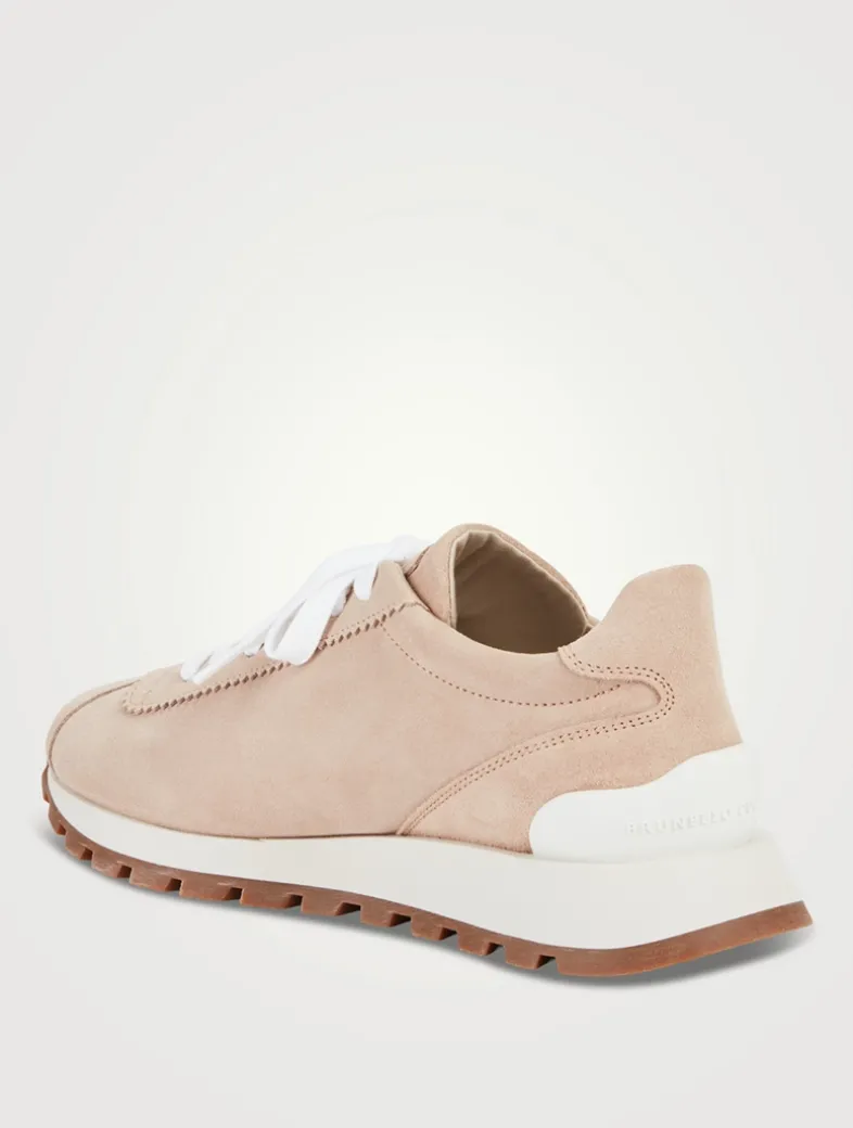 Refined materials and iconic details characterize these new suede sneakers. Their velvety texture brings out the colour of the season, while the label in shiny monili, the iconic embellishment of the BRUNELLO CUCINELLI collections, adds a sparkling note. The cotton-blend fabric lining and the rubber outsole provide the fit with added comfort.