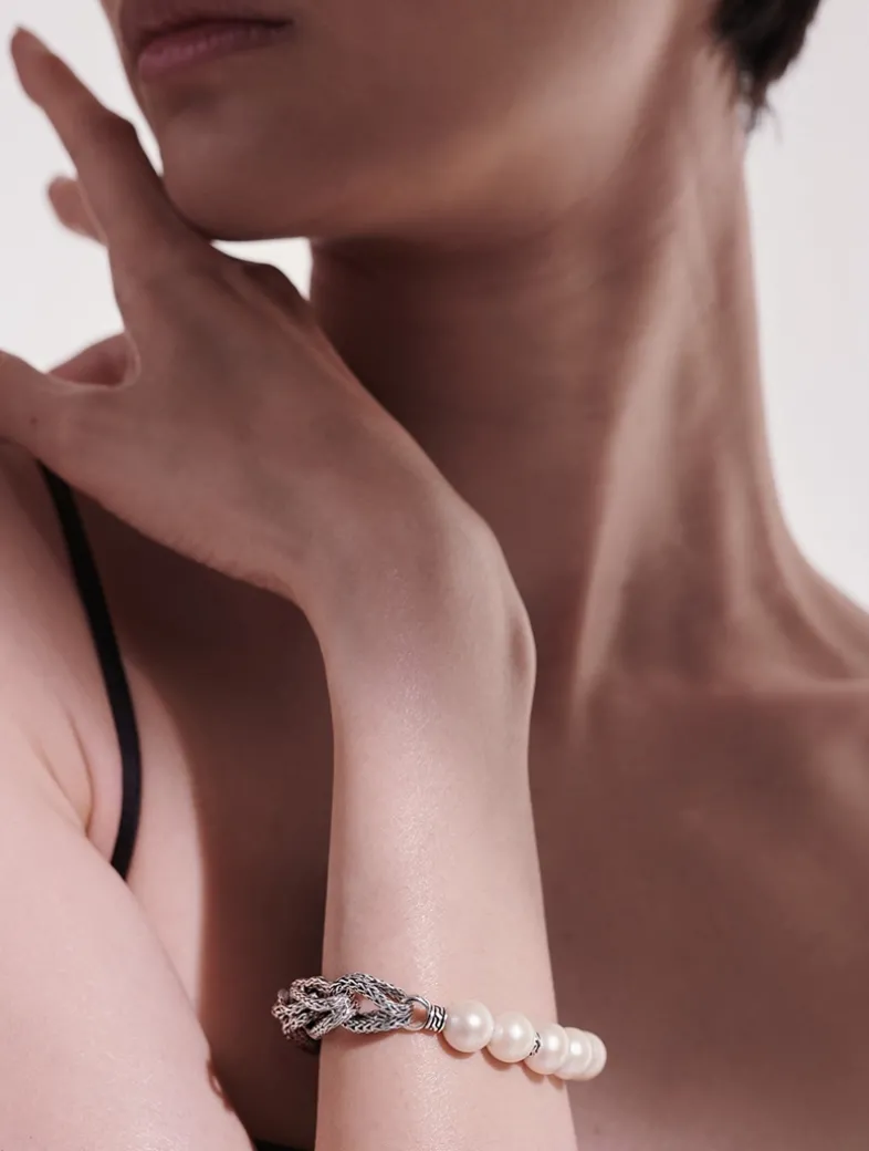 Classic with a twist, this artisan-handcrafted piece pairs sterling silver links with lustrous freshwater pearls.