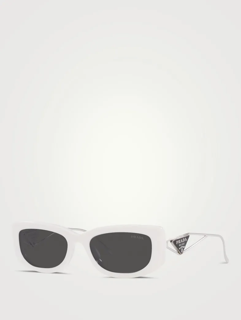 These rectangular sunglasses feature open metal temples decorated with PRADA triangle logo inserts inspired by the maison’s jewellery.