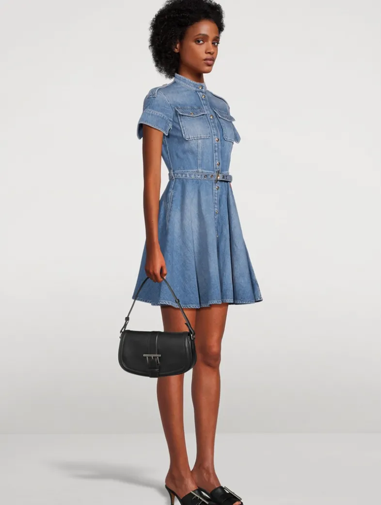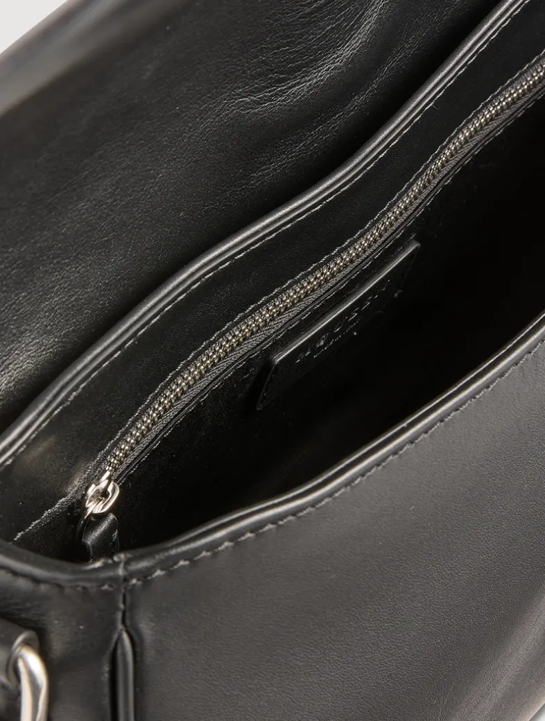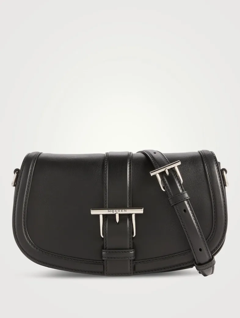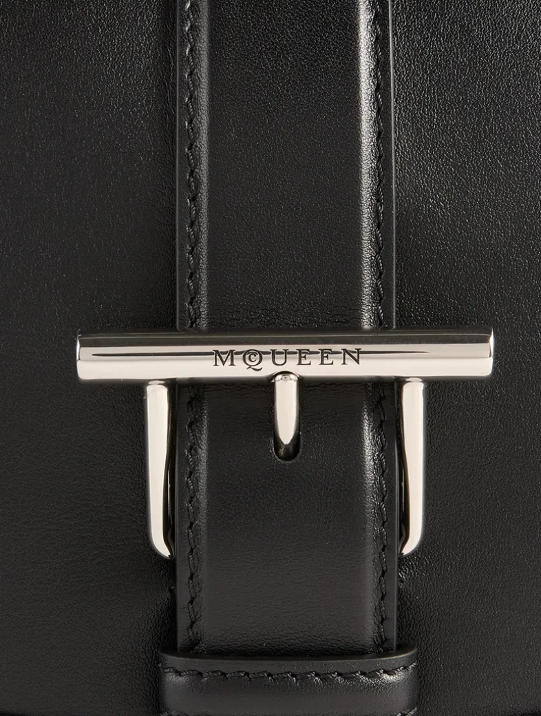 Made in Italy, this satchel has a sleek silhouette crafted from smooth calf leather with bombe leather frames. It has an antique silver-finished T-Bar on the front leather belt engraved with the McQueen logo. Can be carried on the shoulder or crossbody with the detachable straps. Finished with one central compartment, one open back pocket, and one internal zip pocket.