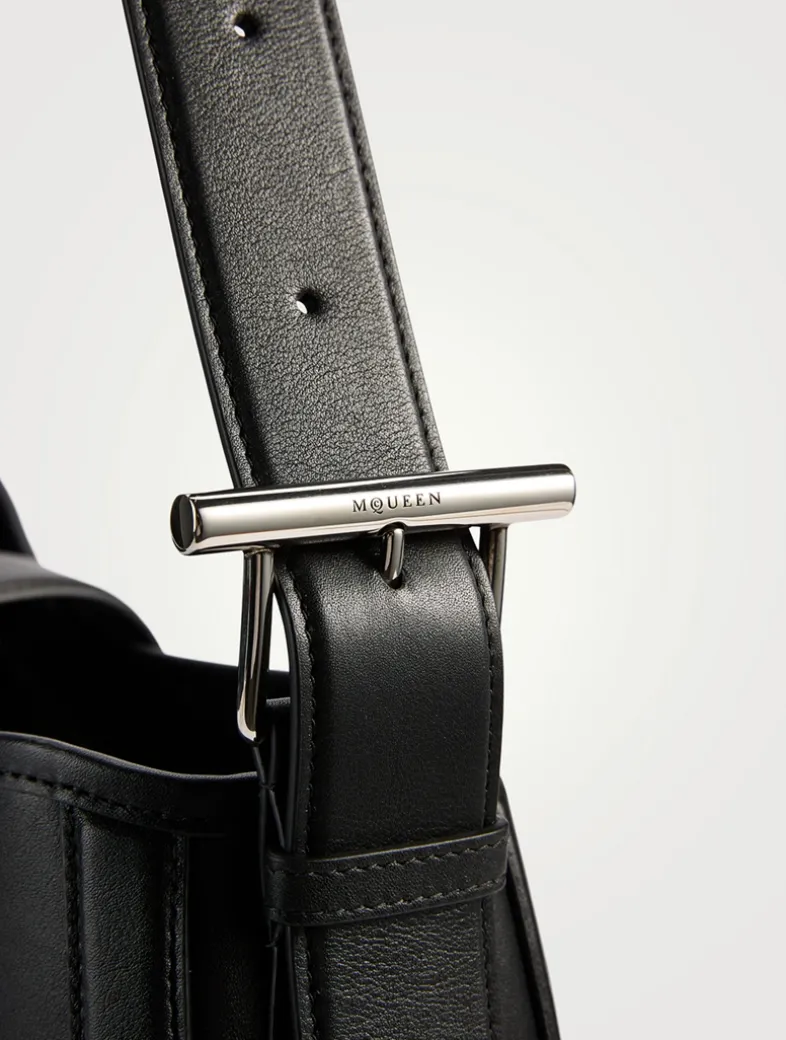 Flaunting a rounded silhouette, this roomy shoulder bag is crafted from smooth calf leather. Detailed with a statement T-Bar buckle engraved with the McQueen logo. It features one main compartment with zip pocket.