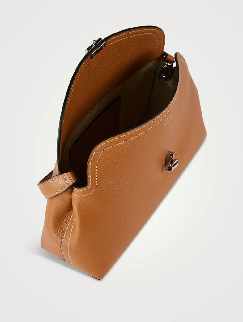 Sculptural clutch named after the metal twist lock securing the curved top flap. It’s handcrafted in Italy from pebbled leather finished with decorative topstitching and protective feet, then opens to a microsuede interior fitted with a leather card slot. Hold it in your hand or carry it across the body using the optional strap.