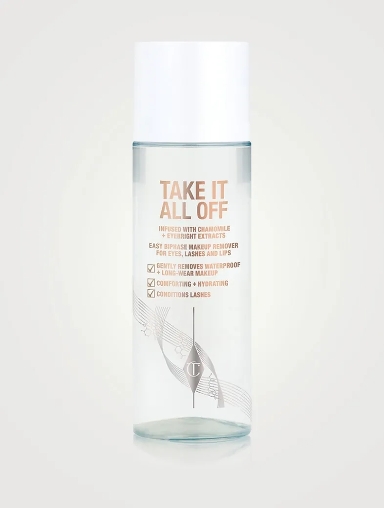 A gentle biphase makeup remover for eyes, lashes and lips, which effortlessly removes longwear & waterproof makeup. Discover charlotte’s innovative hydrating formula infused with soothing chamomile and eyebright extracts to dissolve + gently remove waterproof and long wear makeup. Suitable for sensitive eyes and contact lens wearers!