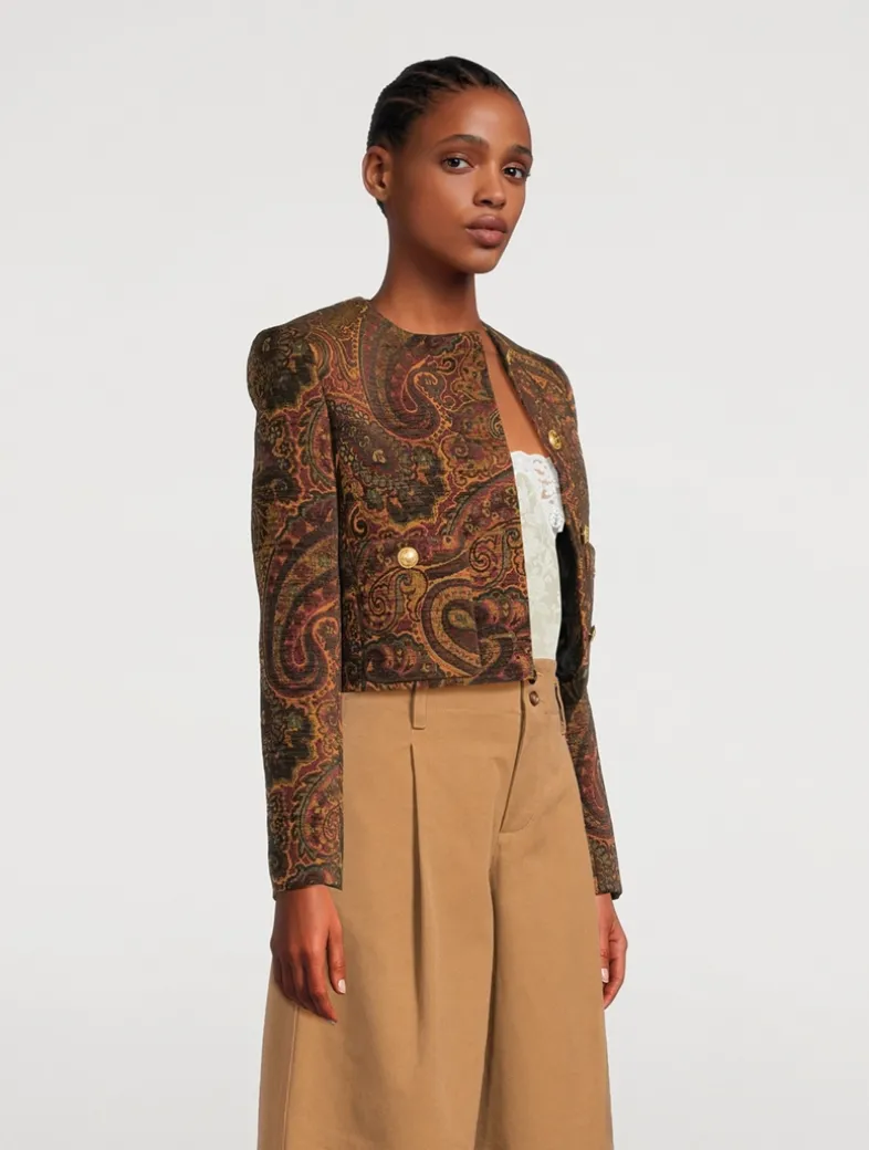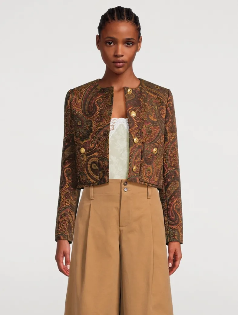 Cut to a boxy, slightly cropped silhouette, this collarless jacket in paisley tapestry jacquard features gold-tone buttons and front patch pockets.