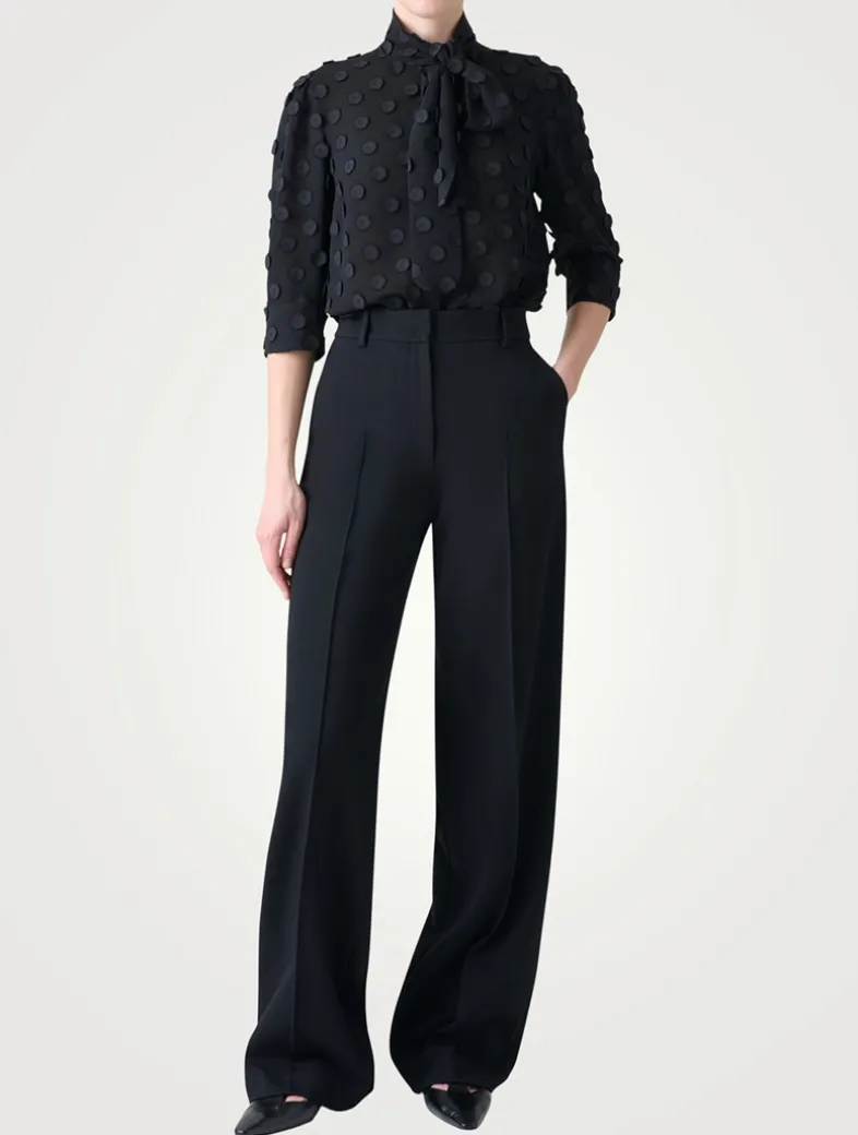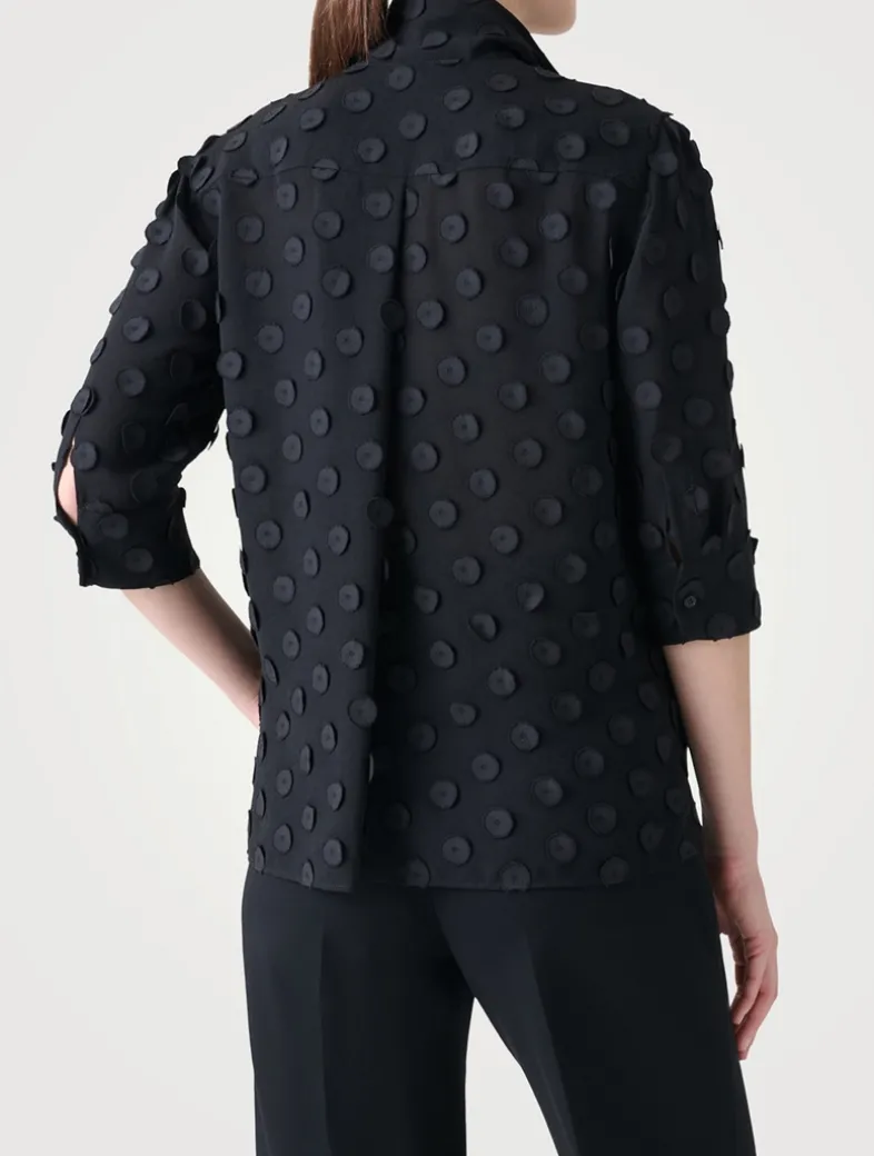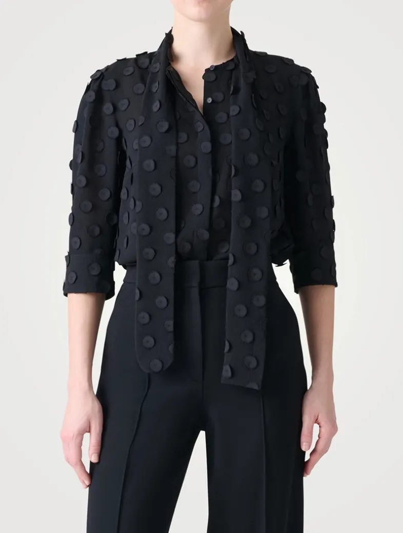Topped with a vintage-inspired pussybow, this blouse features side slits, a back pleat, and three-quarter sleeves. It is crafted from a techno georgette with a tonal 3D polka dot motif allover.