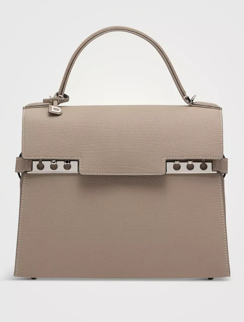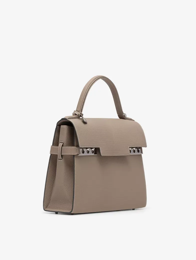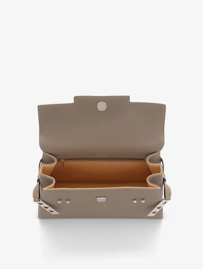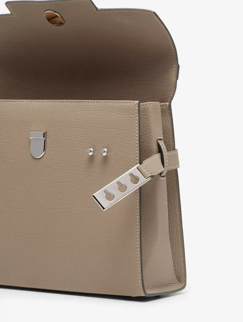 Spacious, sculptural bag featuring a removable and adjustable shoulder strap. Crafted in Crispy Calf leather in Tourterelle and Ivory. Finished with silver metal hardware.