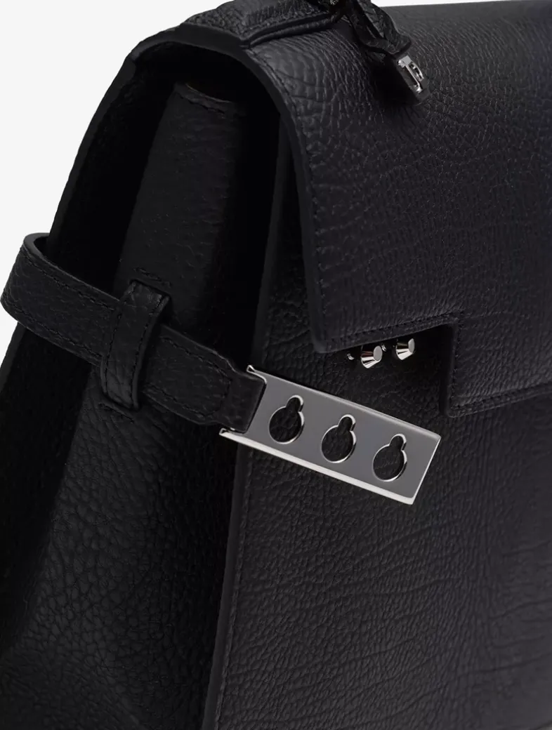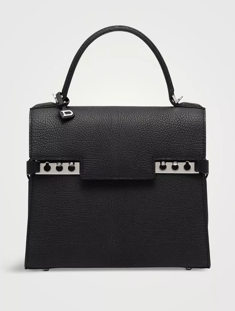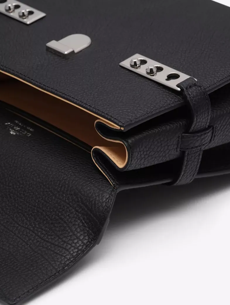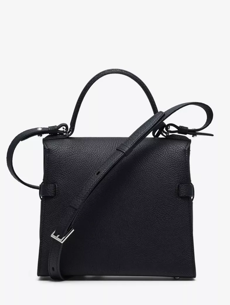 Compact, sculptural bag featuring a removable and adjustable shoulder strap. Crafted in Crispy Calf leather in the shade Black. Finished with silver metal hardware.