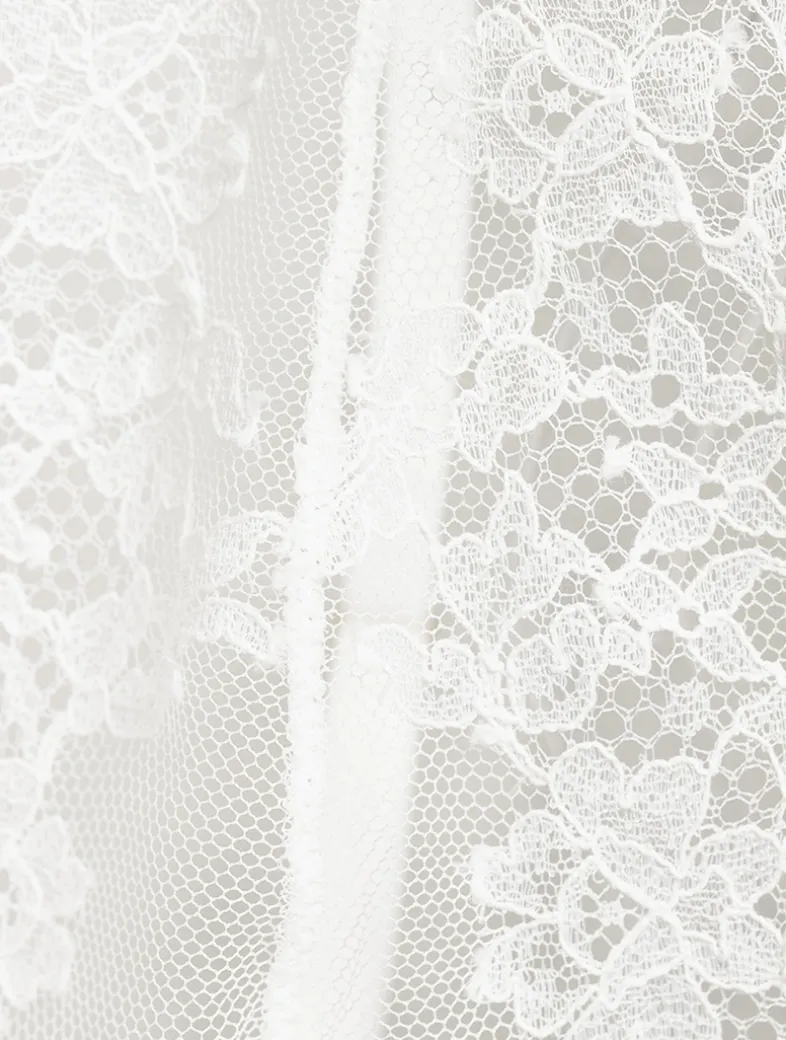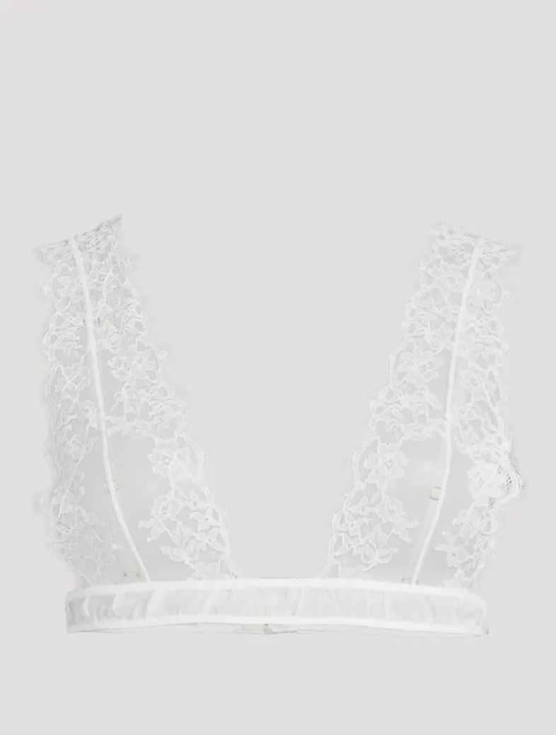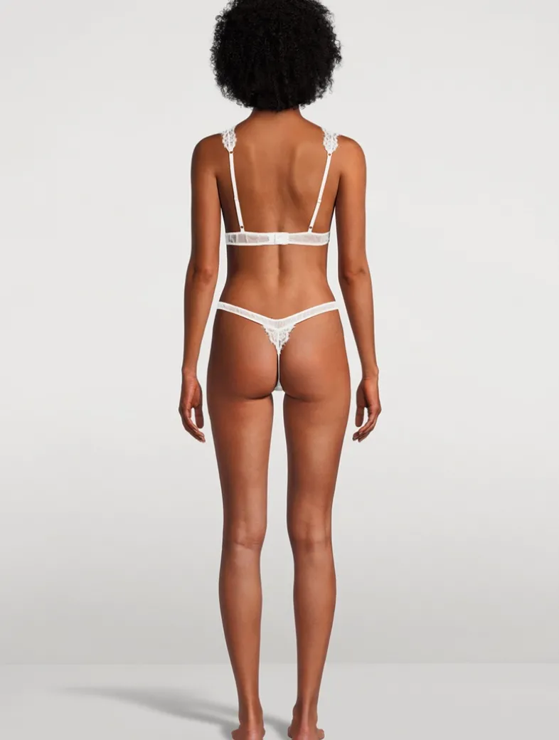 This plunging bra is crafted from delicate French lace with eyelash fringe trim. Framed by adjustable straps, it is finished with a back clasp closure.