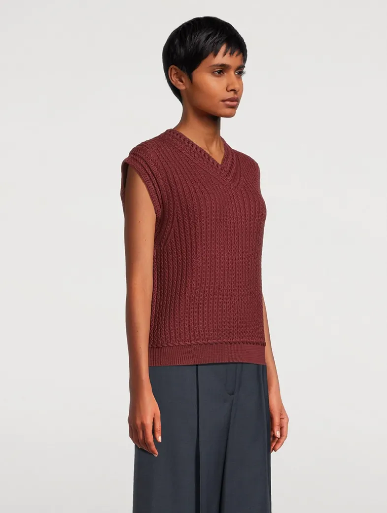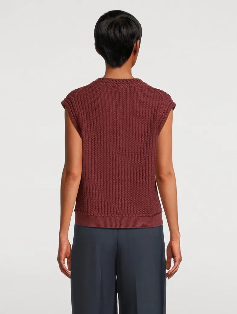 This textured cable knit V-neck sweater features a relaxed fit perfect for layering, crafted from 100% cotton with an easy pull-on design.