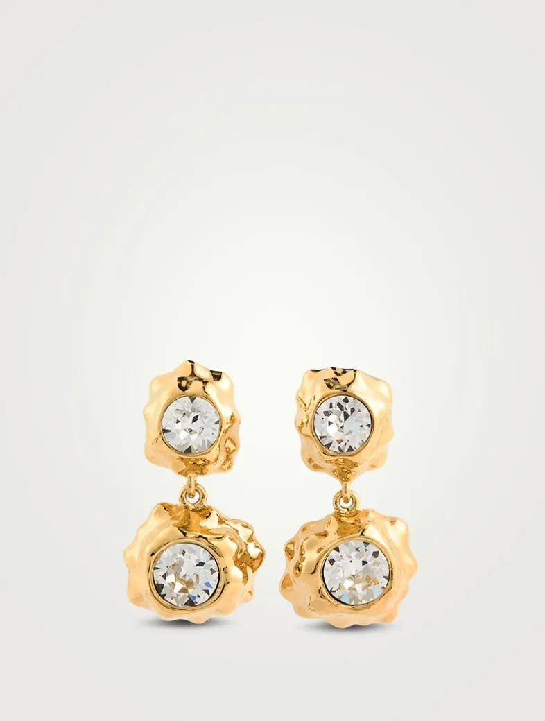 These double drop earrings have fine lines forming a bold, intricate structure, inlaid with glass crystals that contrast textured metal with bright sparkle.