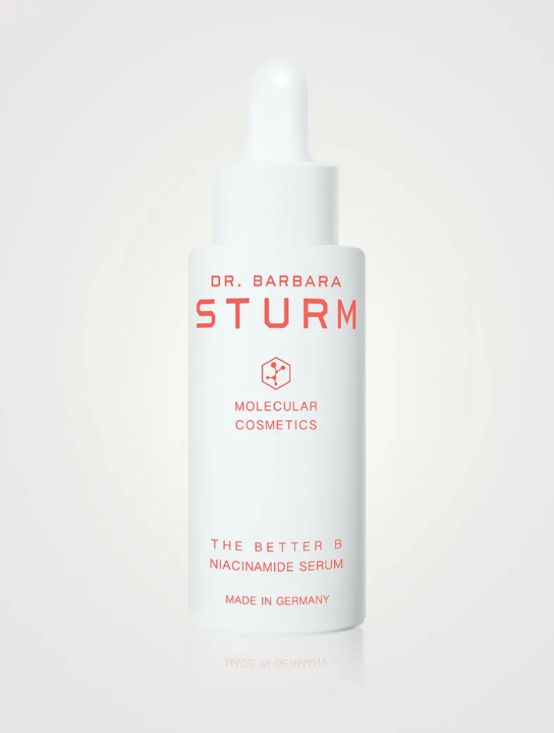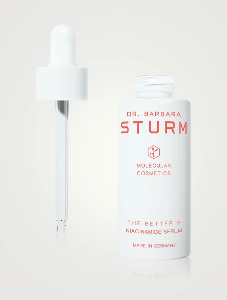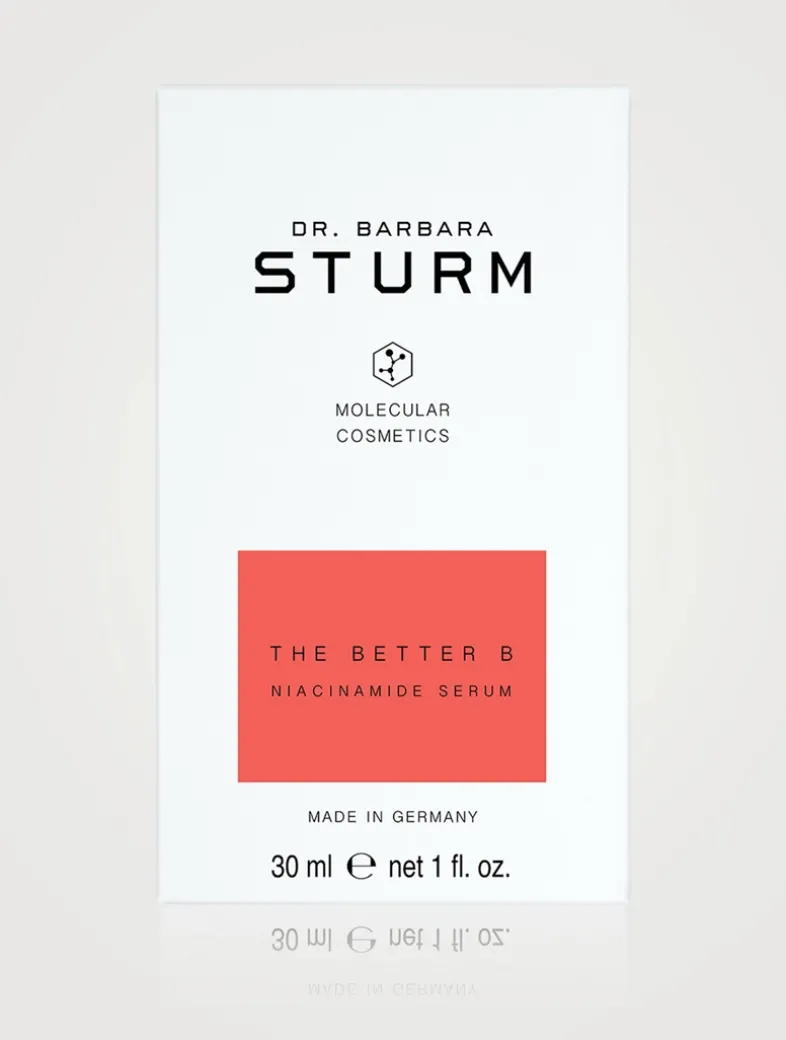 Dr. Sturm’s THE BETTER B, is the ultimate skin perfector that specifically targets the pores, reducing and refining their appearance for a radiant complexion. Dr. Barbara Sturm’s THE BETTER B NIACINAMIDE SERUM, is the ultimate skin perfector that specifically targets the pores, reducing and refining their appearance for a radiant complexion. The serum contains a potent ingredient complex that includes pure Vitamin B3 and Ectoin, an Amino Acid which helps to protect against environmental hyperpigmentation and premature skin aging. The formulation also includes Marine Exopolysaccharides (Plankton) which helps strengthen the skin barrier, boost hydration, and support the skin’s natural restorative processes for a smoother, softer and refined skin texture, and Panthenol (Provitamin B5), an ultra-hydrating ingredient that also has soothing properties. THE BETTER B is ideal for coarse, rough, uneven complexions with visibly enlarged or sunken pores and classic combination skin types. With regular use, it will leave skin looking more even, radiant and noticeably refined.