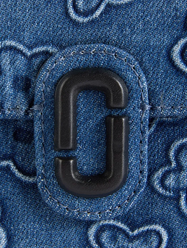 A convertible shoulder bag featuring dimensional puffy daisies for a playful, textural touch. Secured with a sleek magnetic closure, this piece is finished with signature J Marc seal. Crafted from washed denim, it offers a soft yet structured silhouette. With ornamental piping and rounded accents, it can be styled four ways with a removable leather strap that doubles as a wristlet, and a crossbody chain strap. For a sleek clutch look, go strapless.