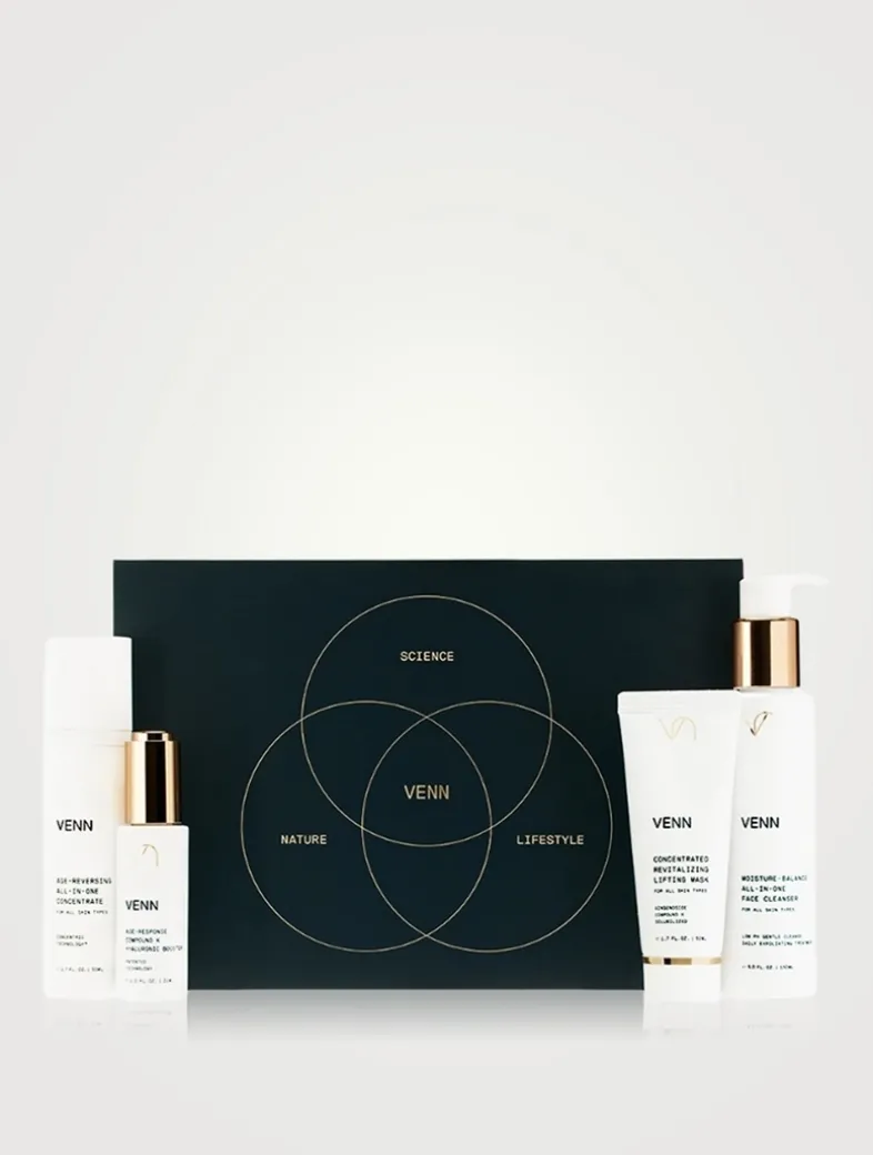 Set of four self-care products for cleansing, brightening, and hydrating the skin. The Moisture Balance All-In-One Face Cleanser is for removing makeup and exfoliating the skin. Features camellia sinensis catechins and vitamin B3. Vegan and cruelty-free. The Age-Response Compound K Hyaluronic Booster is a facial serum for brightening and firming the skin. Features compound K, hyaluronic molecules, peptides, and niacinamide. Vegan and cruelty-free. The Age-Reversing All-In-One Concentrate is a facial cream for reducing the appearance of wrinkles and hydrating the skin. Features Concentric Technology™ and peptides. Cruelty-free. The Concentrated Revitalizing Lifting Mask is a creamy facial mask for hydrating and brightening the skin. Features compound K and peptides. Vegan and cruelty-free.