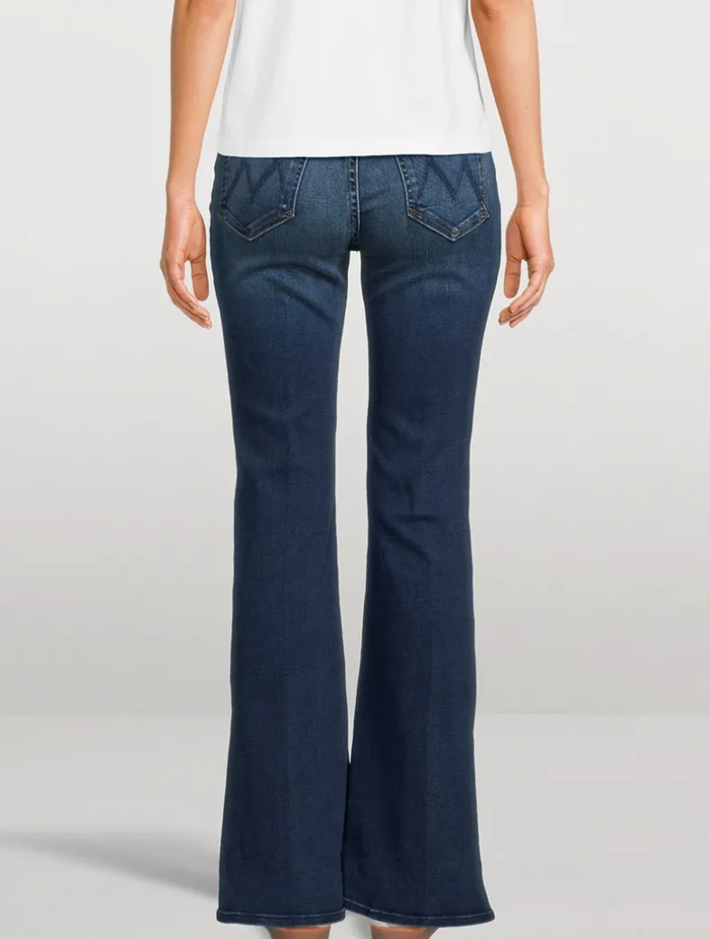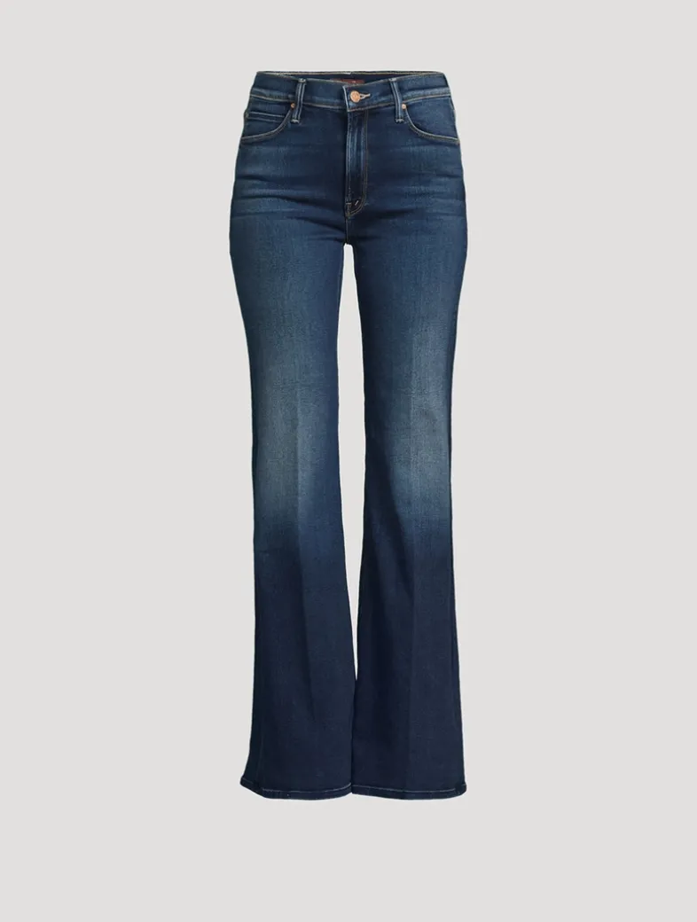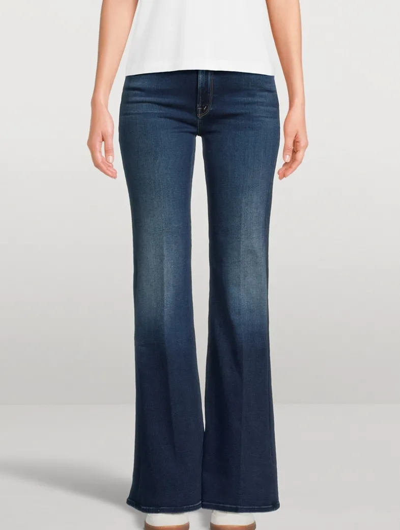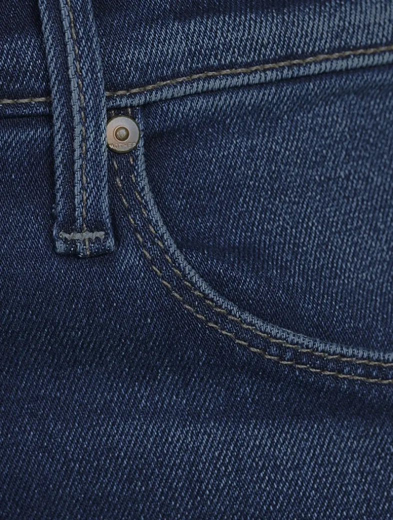 A high-rise, flare-leg with a 34-inch inseam. Cut from stretch denim, Unchartered Water is a dark blue wash with super subtle whiskering and fading.