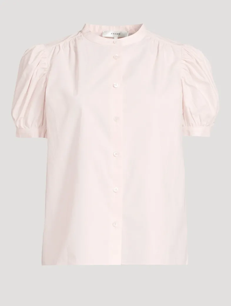 Quintessentially FRAME, this organic cotton poplin top has short puff sleeves enhanced by gathered detailing. Feminine, yet polished, the blouse also features a round banded collar.