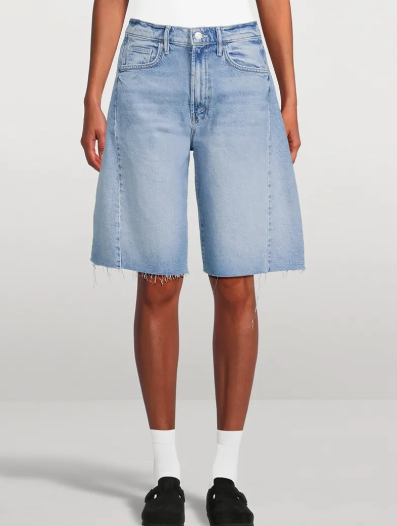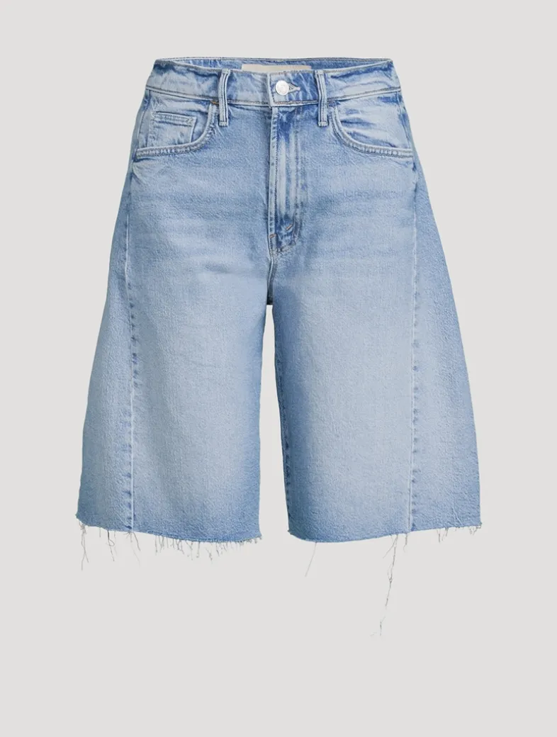 These super high-waisted Bermuda shorts are designed with a wide leg, knee-length inseam, and a frayed hem. Cut from semi-rigid SUPERIOR denim with whiskering and fading throughout.