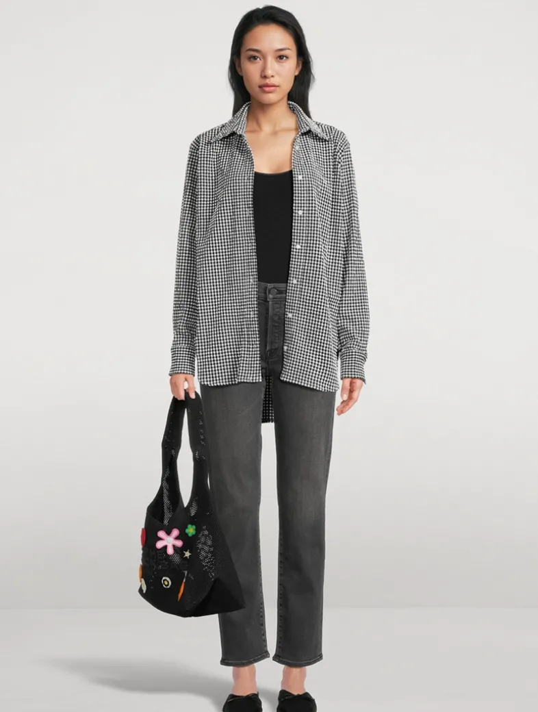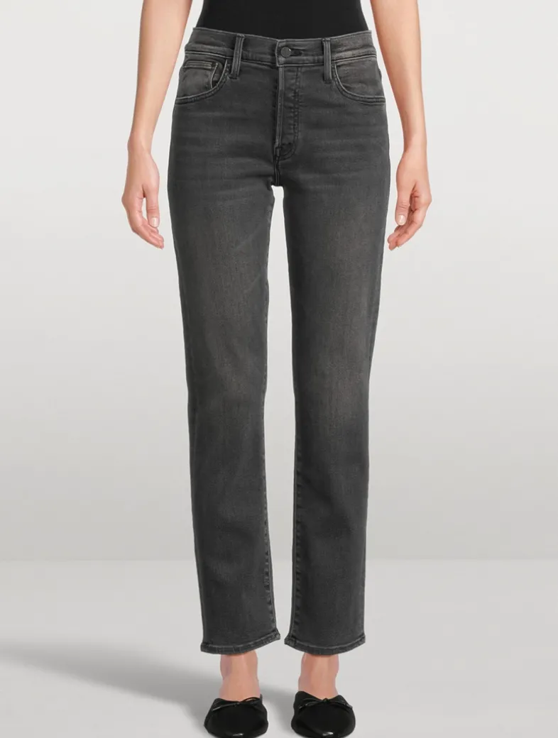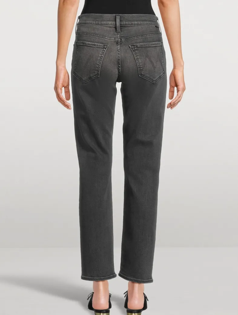 This slim straight-leg features a mid rise, button fly, low-set back pockets, and a clean hem. Cut from stretch denim with whiskering, fading, and tonal hardware.