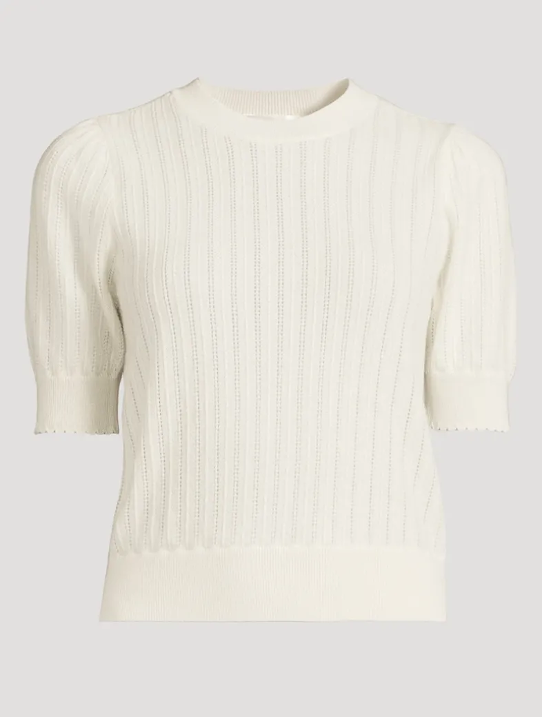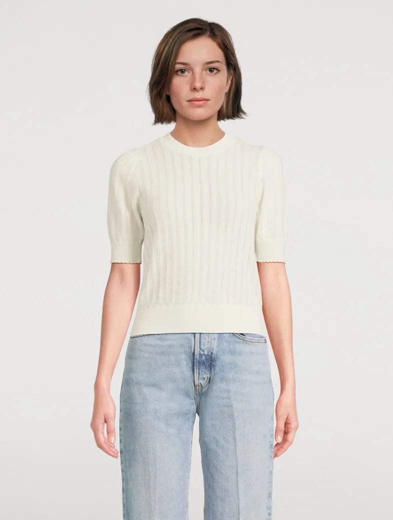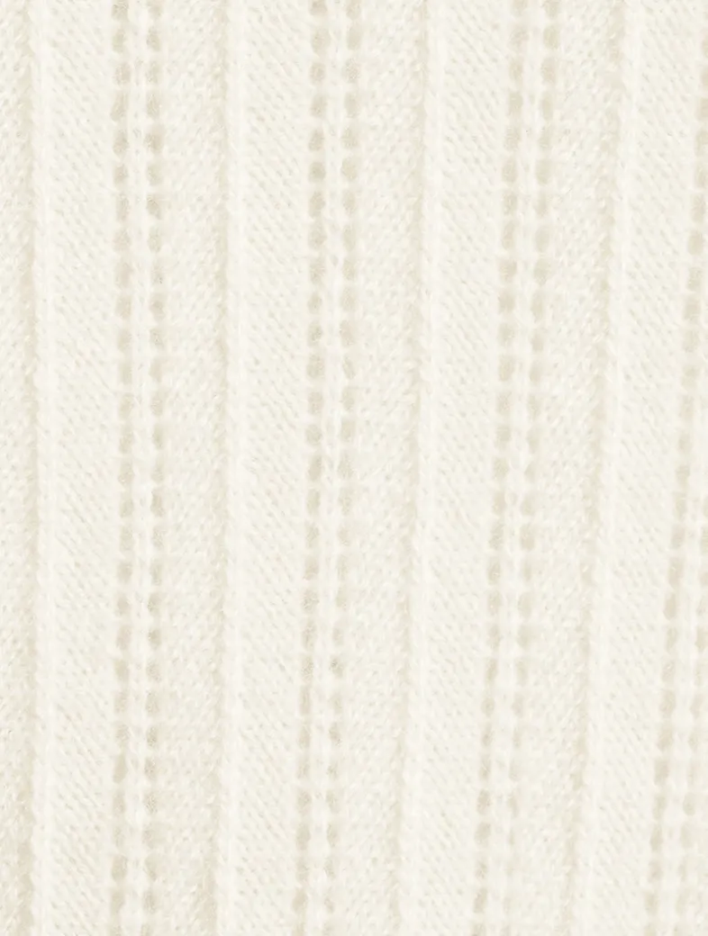 A lightweight cashmere knit with airy ladder pointelle stitching. With softly scalloped edges for an effortless, feminine feel.