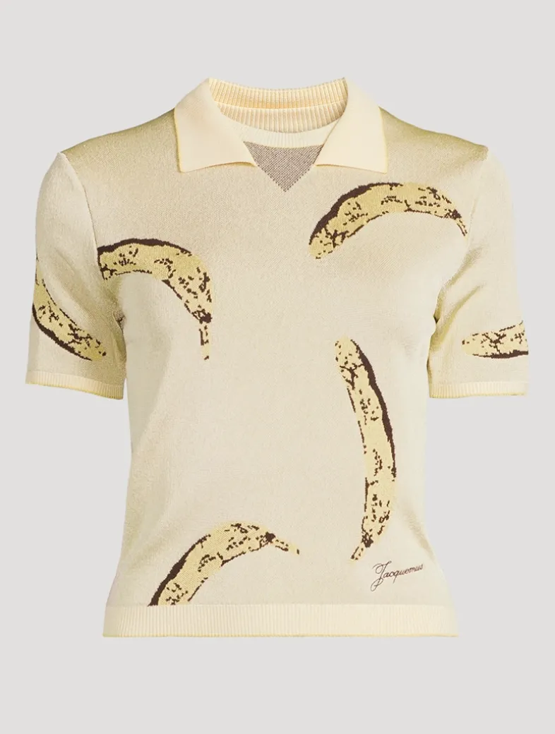 This short-sleeve top blends a classic sportswear silhouette with whimsical detailing. Crafted from a lightweight knit, it features a playful banana jacquard motif and solid ribbed trim. It is finished with a double crew and polo collar for a trompe l’œil effect.