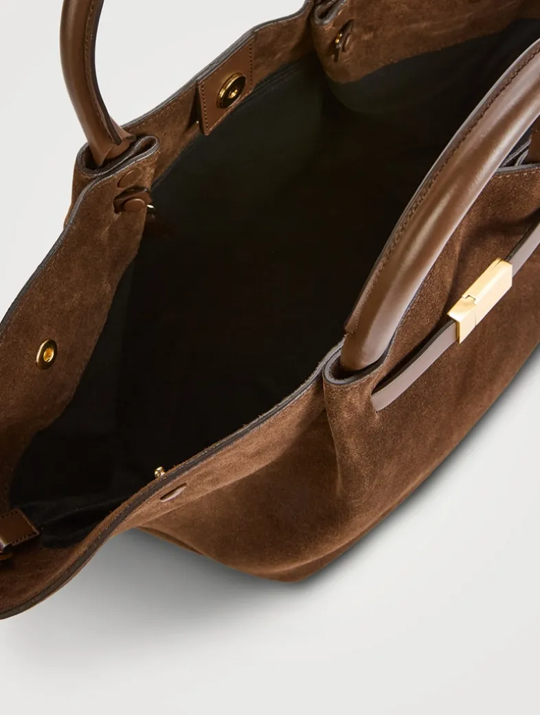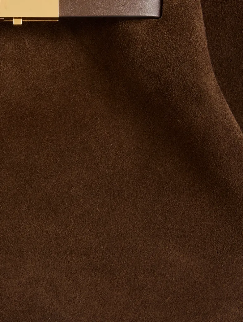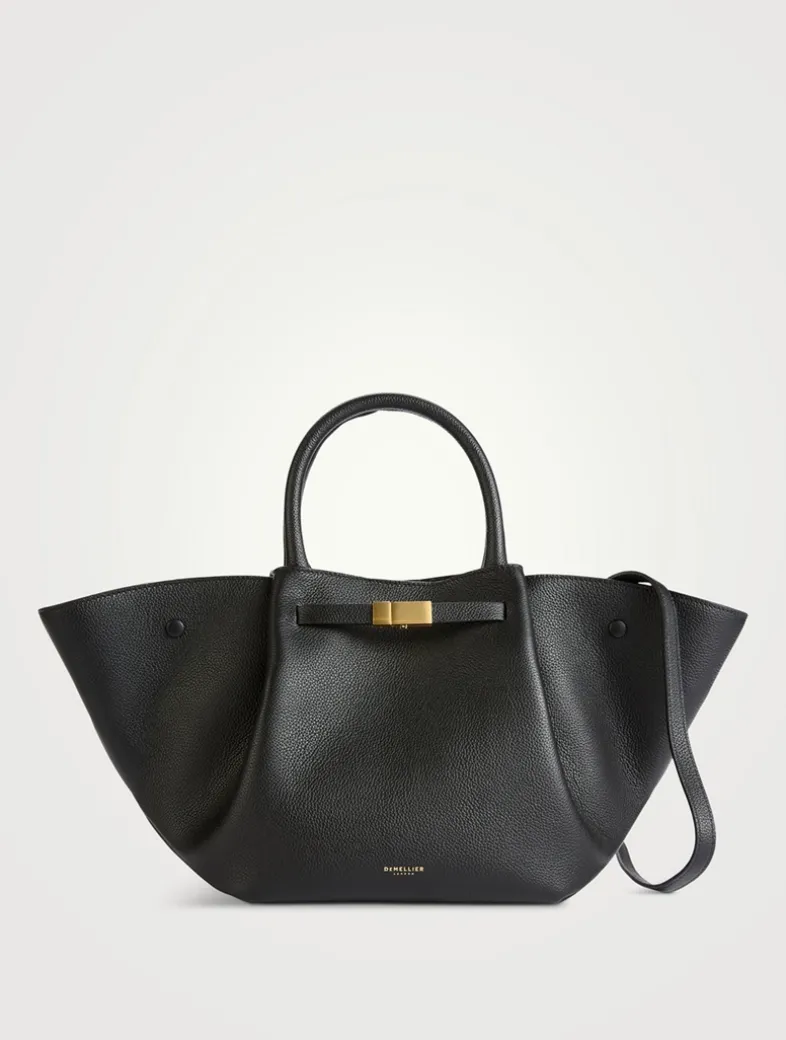 This bag’s modern yet timeless silhouette and subtle luxury finish makes it the perfect daytime companion. The interior can be safely closed off with a central internal magnet, while the base is constructed with triangular folds on each side and enhanced with metal feet. The comfortable tubular handles sit nicely in the crook of your elbow or can be held by hand.