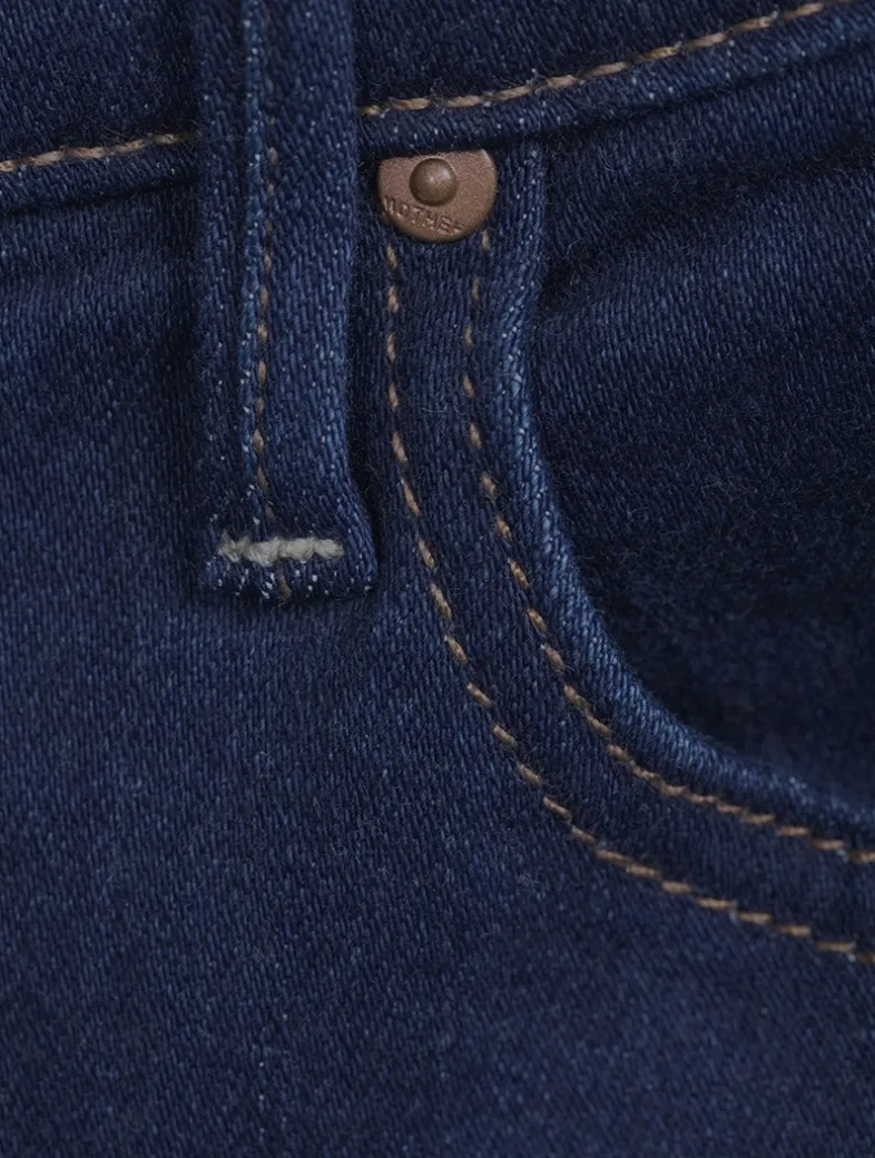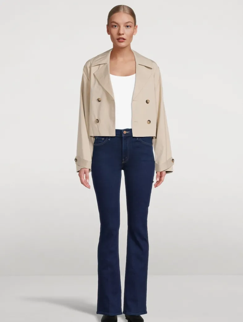 Cut to a narrow silhouette, these flare jeans are designed with a mid rise and a long inseam with a clean hem. Made from stretch denim in a deadstock-inspired dark wash.