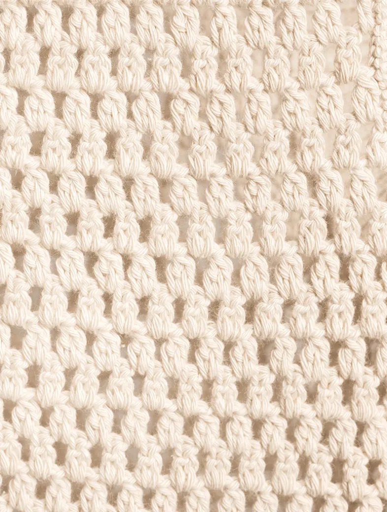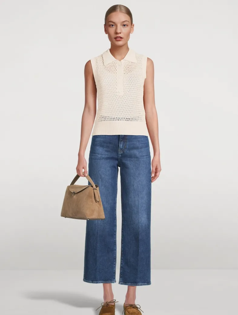 Knit from 100% cotton yarns, this sleeveless top has an open-weave crochet design, ensuring it can be layered or worn on its own to reveal a hint of skin. It is topped with a ribbed polo collar and finished with a buttoned closure.