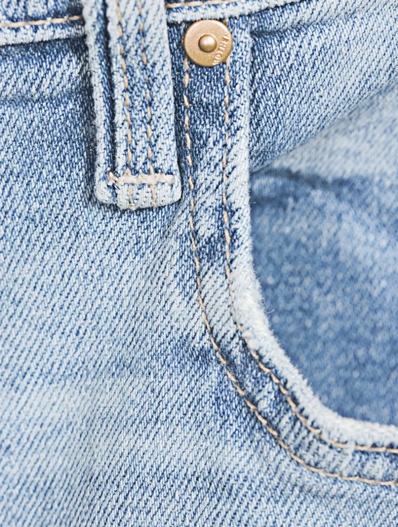 These high-rise jeans are designed with a wide straight leg, zip fly, an ankle-length inseam, and a clean hem. Crafted from stretch denim with whiskering and fading at the knee.
