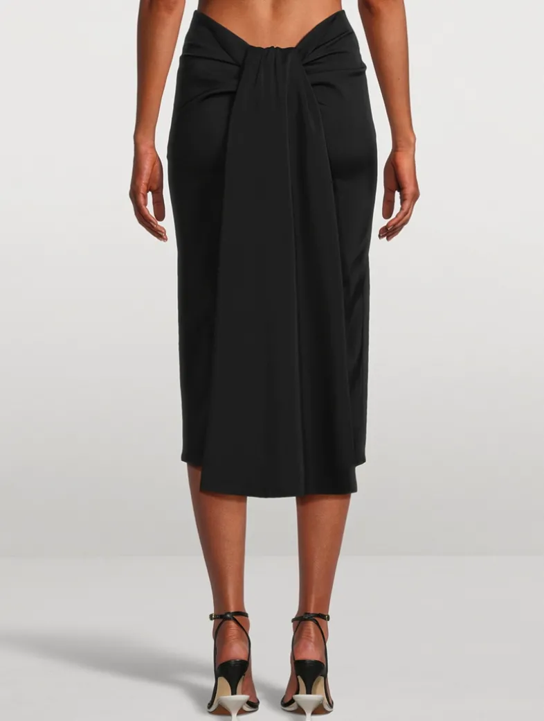The minimalist silhouette of this stretch viscose pencil skirt is offset by a folded train detail in the back with a dipped waist. Cut to a high rise, it has a below-the-knee length and a twin stitched hem.