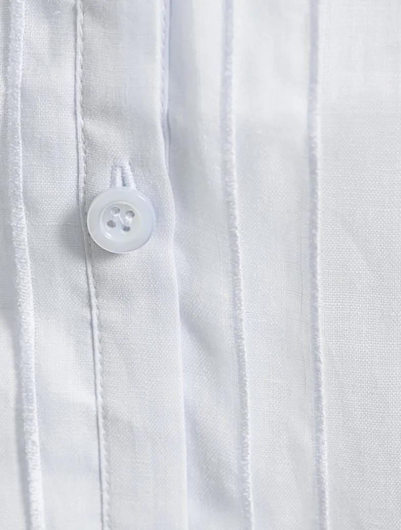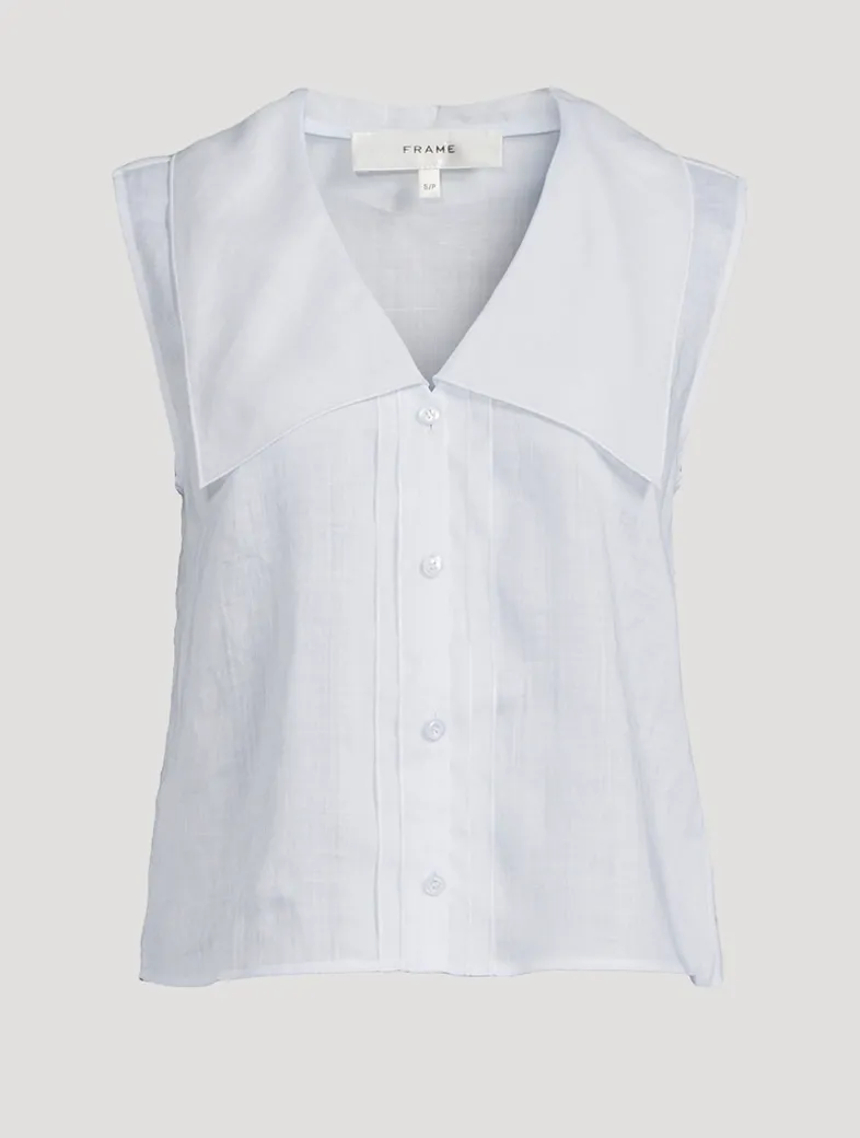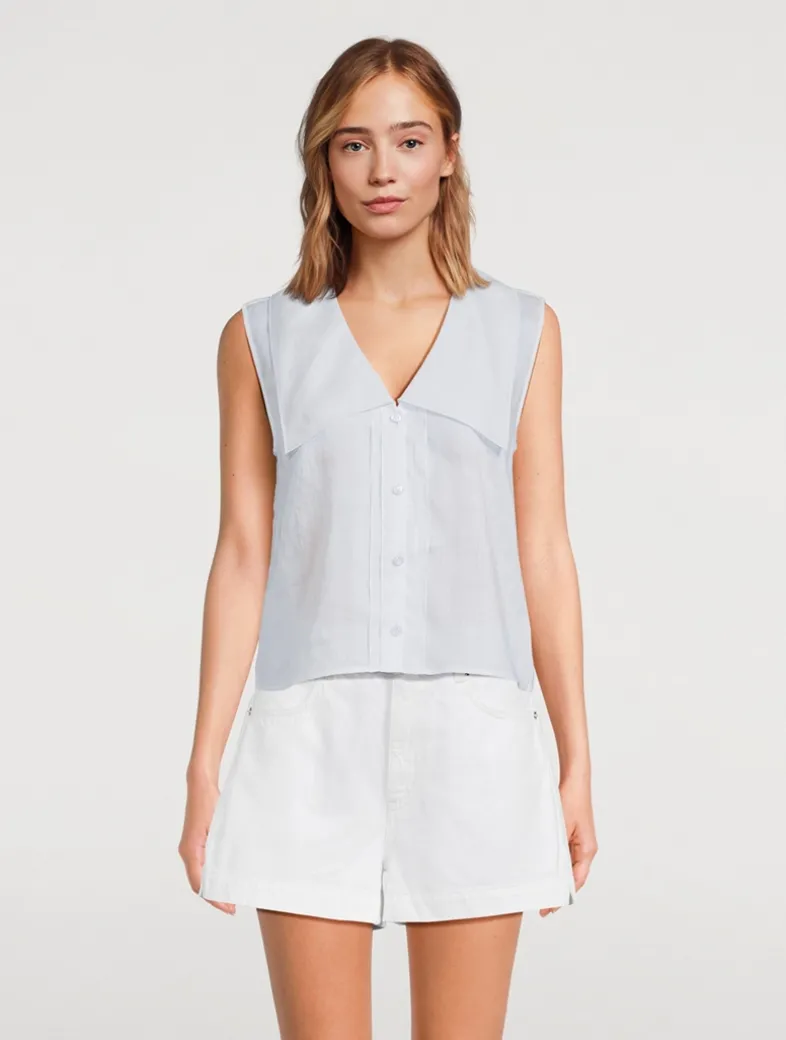 A sleeveless take on classic shirting, finished with a soft sailor collar and tuxedo-inspired detailing at the placket. Cut from 100% ramie for a lightweight feel and easy drape.