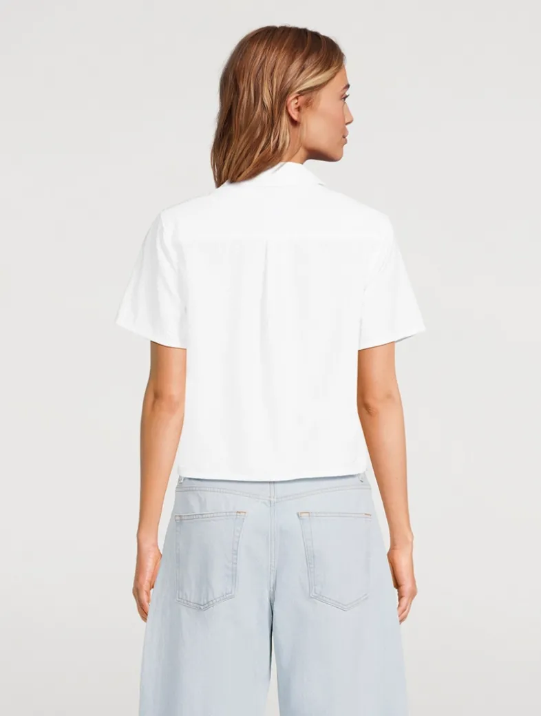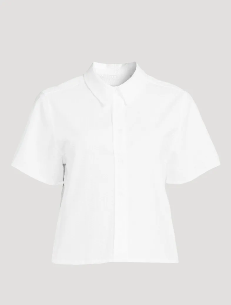 A crisp cotton seersucker construction defines this short-sleeve shirt. It is cut to a boxy, slightly cropped fit with a pointed collar and pleated back yoke.